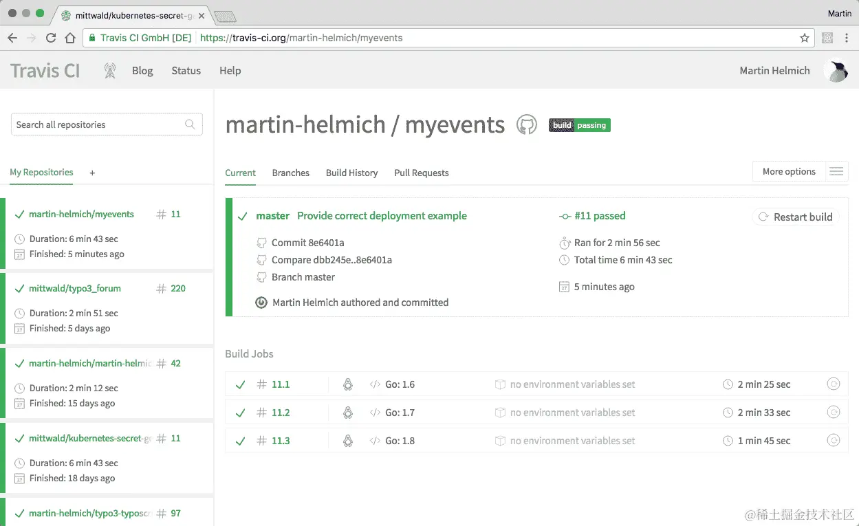 请注意,在这个例子中,我们使用了一个名为gitlab-ci的 Kubernetes 服务账户(之前,我们创建了一个名为travis-ci的账户)。因此,为了使这个例子工作,您需要使用在前面部分已经使用过的命令创建一个额外的服务账户。