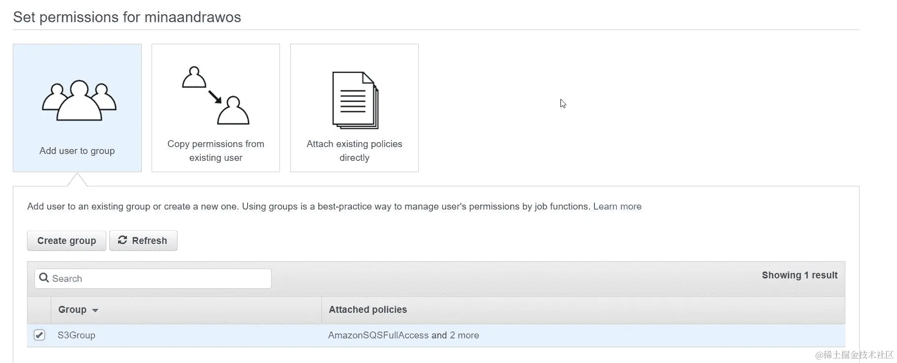 直接附加现有策略:这允许直接将策略分配给新用户,而无需经过组或从其他用户复制。这种方法的缺点是,如果每个用户都被分配了个别的策略,而没有组提供的秩序感,随着用户数量的增加,管理用户将变得繁琐。