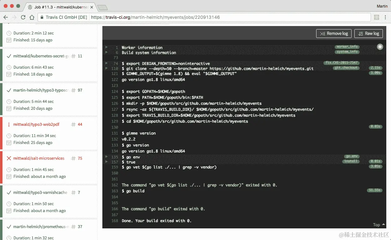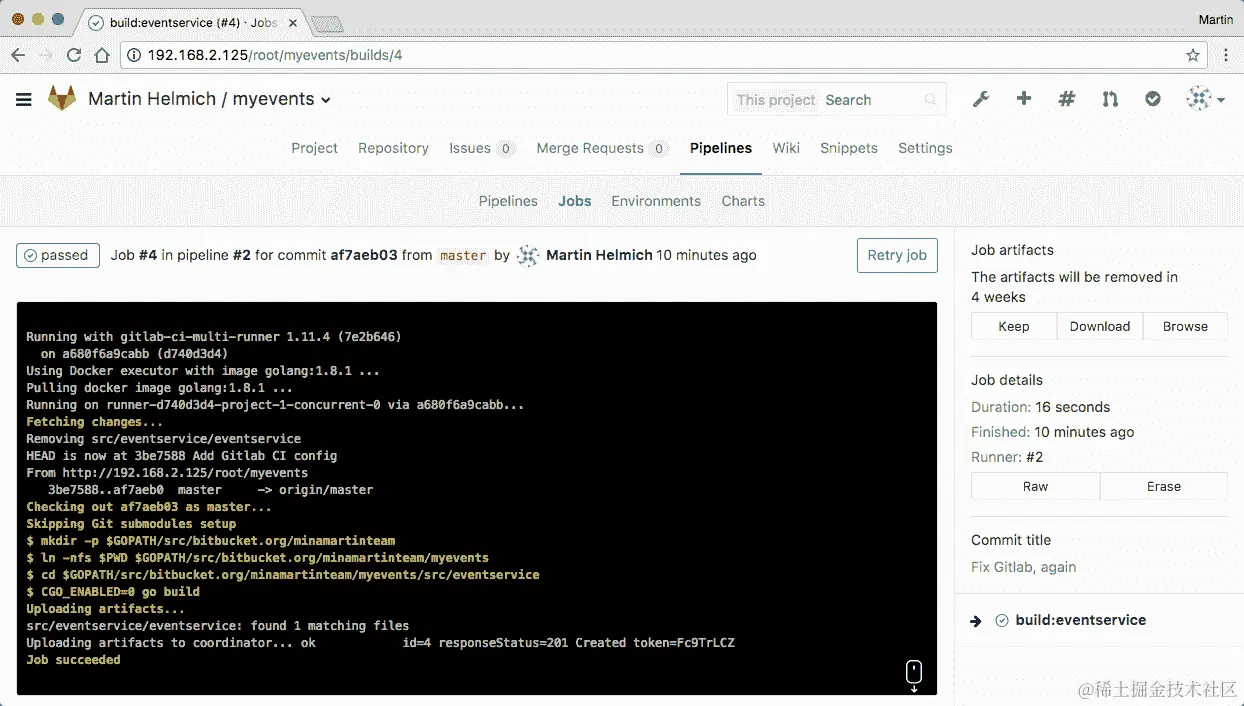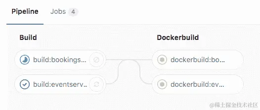 现在,我们的流水线只包括一个阶段(build)和一个作业(build:eventservice)。您可以在Pipelines概述的Stages列中看到这一点。要查看build:eventservice作业的确切输出,请单击流水线状态图标,然后单击build:eventservice作业: