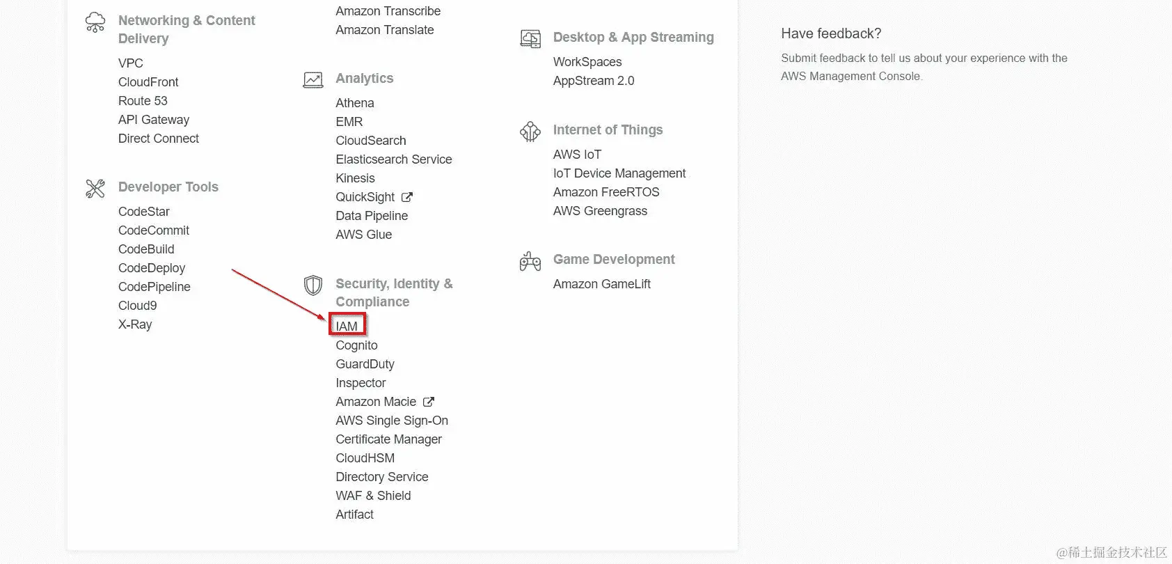 然后我们从“安全,身份和合规性”类别下选择 IAM