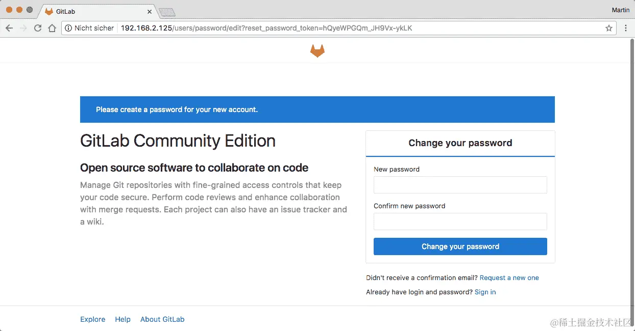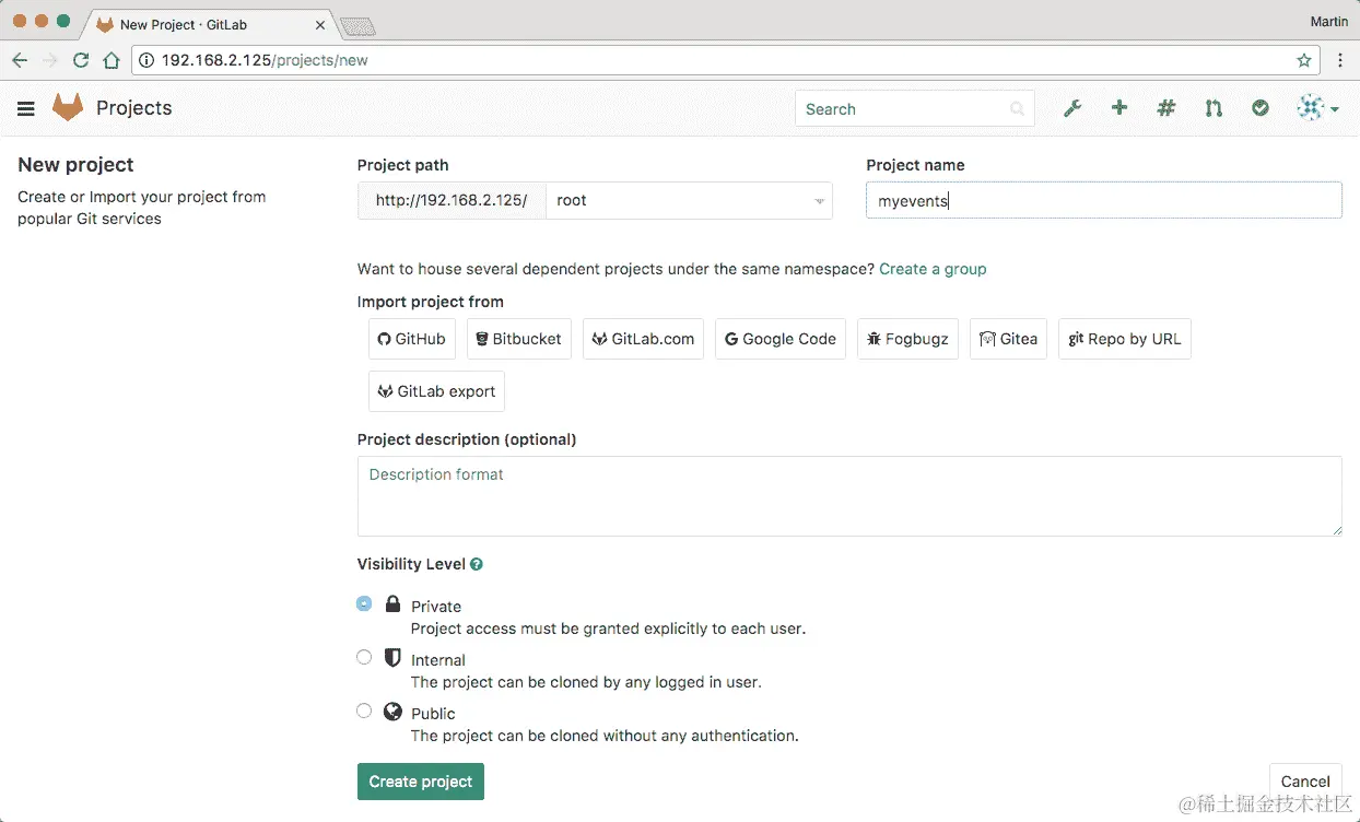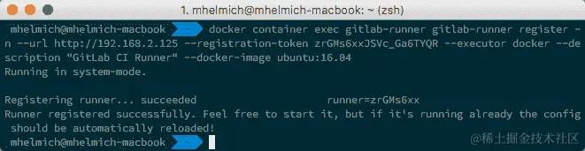 此命令在主 GitLab 实例上注册先前启动的 GitLab CI Runner。--url标志配置了主 GitLab 实例的可访问 URL(通常情况下,当您的 runner 在与主 Gitlab 实例相同的容器网络上时,这可以是http://gitlab;或者,您可以在这里使用您主机的公共 IP 地址,我的情况下是http://192.168.2.125/)。接下来,复制并粘贴--registration-token标志的注册令牌。--executor标志配置 GitLab CI Runner 在自己的隔离 Docker 容器中运行每个构建作业。--docker-image标志配置默认情况下应该用作构建环境的 Docker 镜像。--docker-volumes标志确保您可以在构建中使用 Docker Engine(这一点尤为重要,因为我们将在这些构建中构建我们自己的 Docker 镜像)。