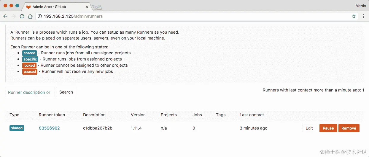 成功注册 Runner 后,您应该能够在 GitLab 管理 UI 中找到它: