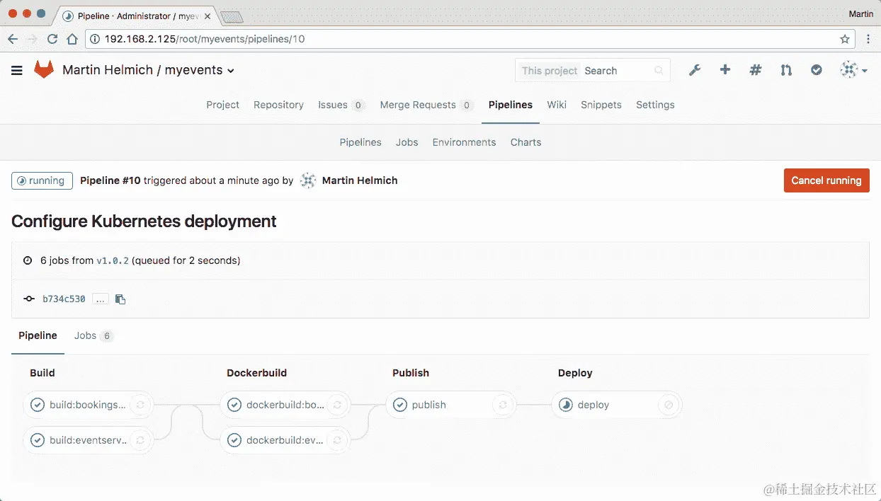 到目前为止,我们基于 GitLab 的构建和部署流水线已经完成。再次查看 GitLab UI 中的流水线视图,以充分了解我们的流水线: