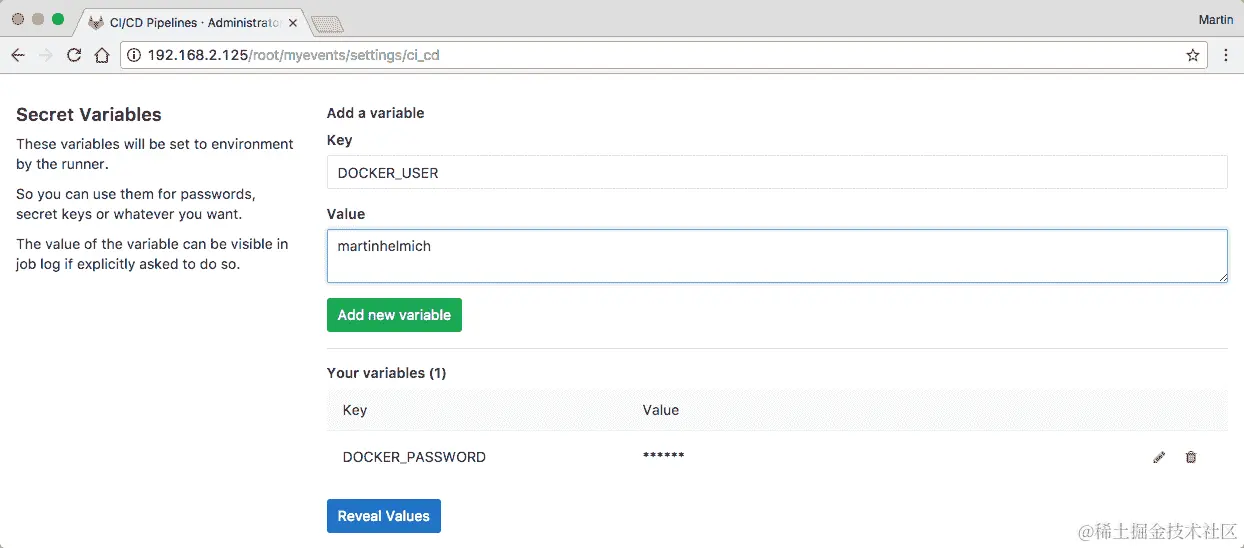 与之前的 Travis CI 构建类似,这个构建作业依赖于环境变量$DOCKER_USERNAME和$DOCKER_PASSWORD。幸运的是,GitLab CI 提供了类似于 Travis CI 的秘密环境变量的功能。为此,在 GitLab web UI 中打开项目的设置选项卡,然后选择 CI/CD Pipelines 选项卡,搜索秘密变量部分: