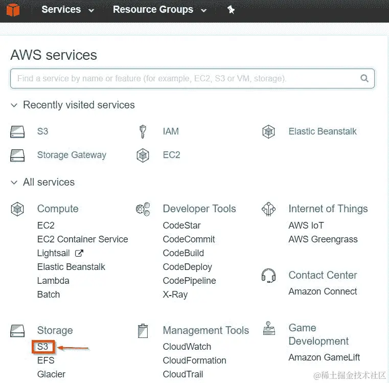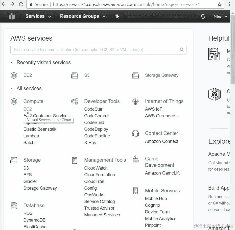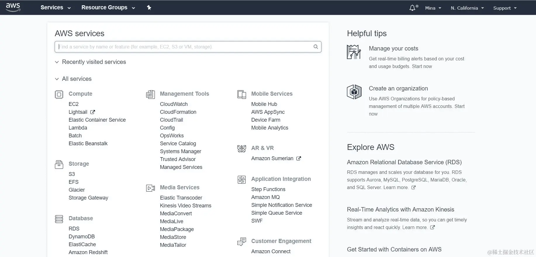 一旦您登录控制台,您将看到一个展示 AWS 提供的服务的网页: