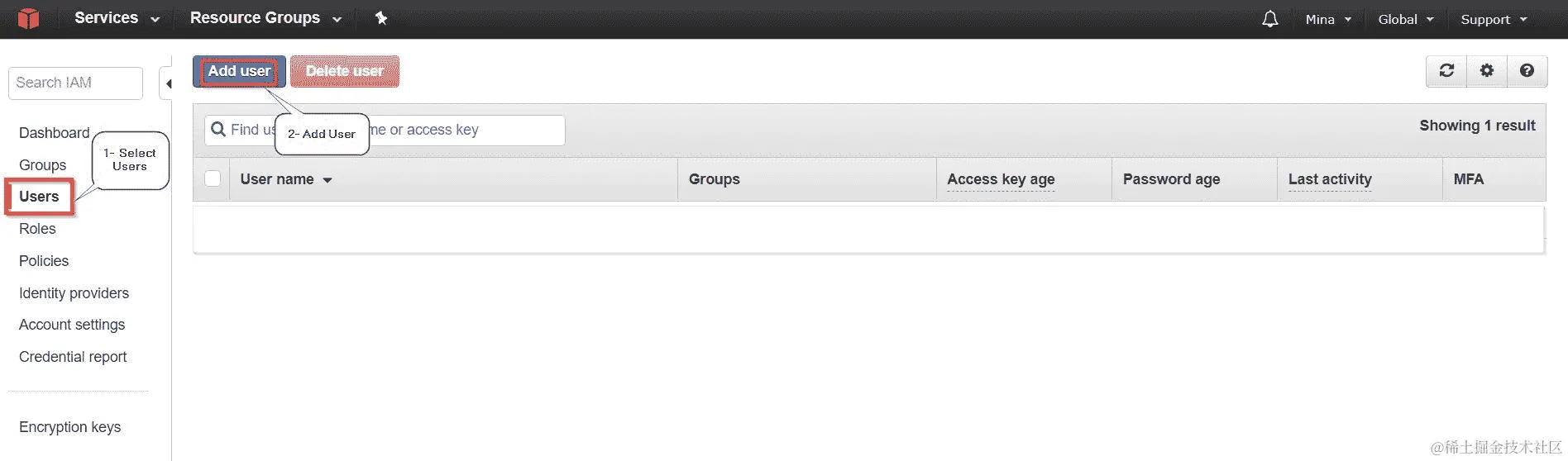 接下来,我们需要点击右侧的“用户”选项,然后点击“添加用户”来创建一个新的 IAM 用户: