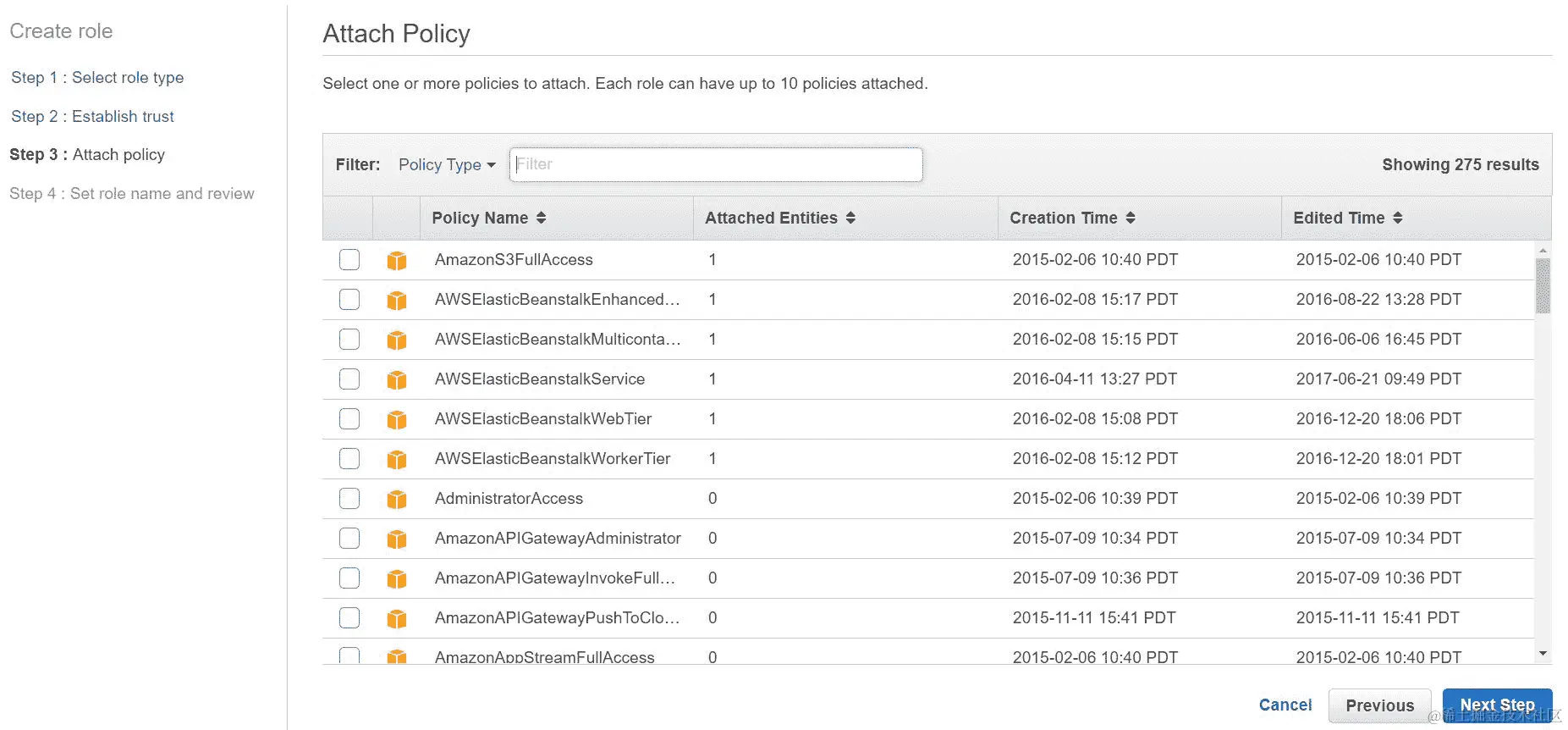 然后,我们将点击下一步。然后,我们需要选择我们的新角色将使用的策略: