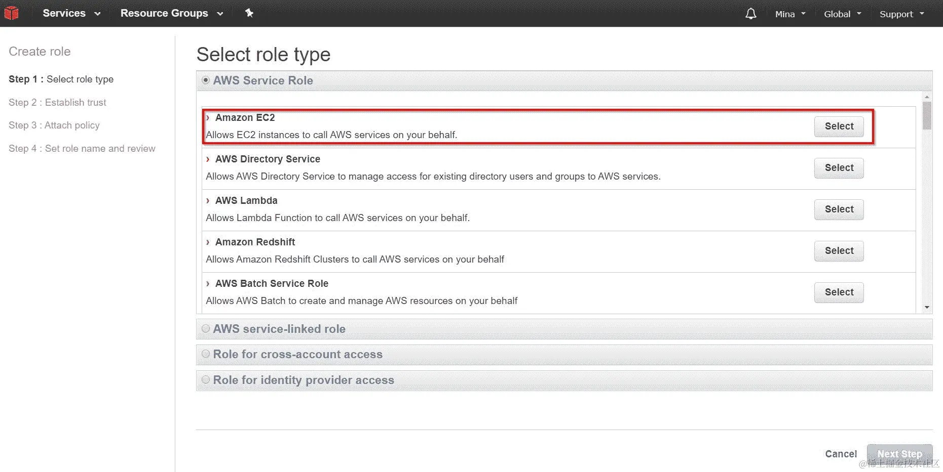 我们首先被要求选择角色类型。对于我们的情况,我们需要选择 EC2 服务角色,然后选择 Amazon EC2: