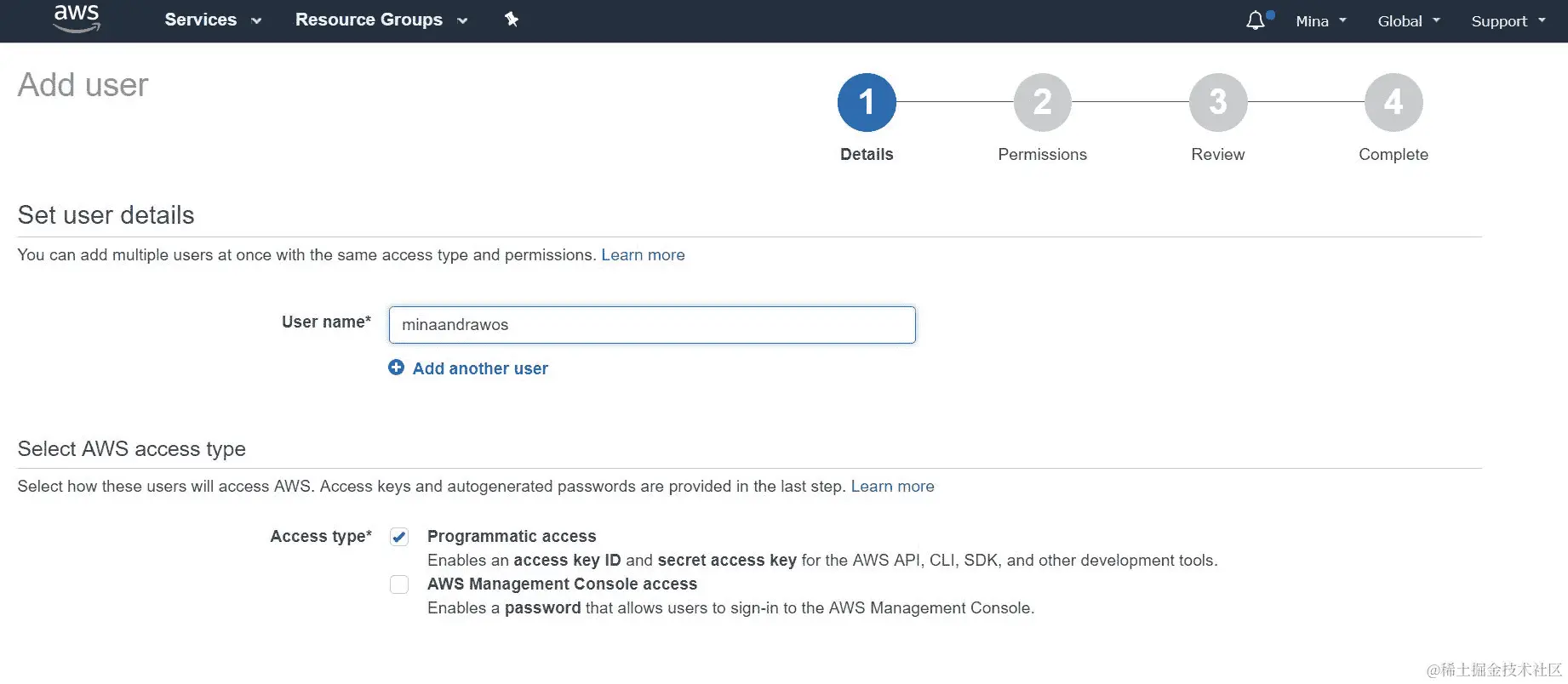 然后,您将被引导使用用户创建向导来帮助您创建用户并生成访问密钥。在此向导的第一步中,您将可以选择用户名并选择用户的 AWS 访问类型。AWS 访问类型包括两种主要类型:程序访问或 AWS 管理控制台访问。显然,为了创建可以被 AWS SDK 使用的用户,我们需要选择程序访问,如下所示: