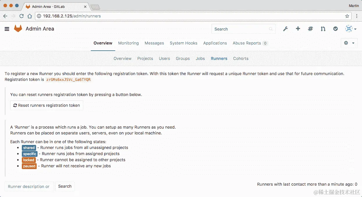 启动 GitLab CI Runner 后,您需要在主 GitLab 实例上注册它。为此,您将需要 Runner 的注册令牌。您可以在 GitLab UI 的管理区域中找到此令牌。通过右上角的扳手图标访问管理区域,然后选择 Runners。您将在第一个文本段落中找到 Runner 的注册令牌: