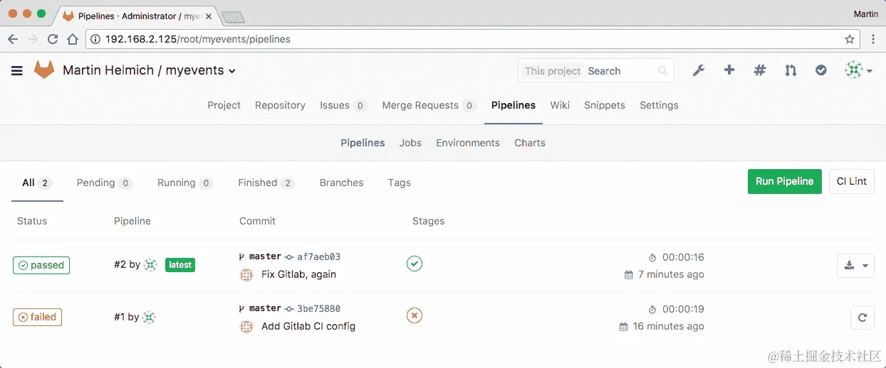当您推送配置文件后,转到 GitLab Web UI 中的项目页面,然后转到 Pipelines 选项卡。您将找到为您的项目启动的所有构建流水线的概述,以及它们的成功情况: