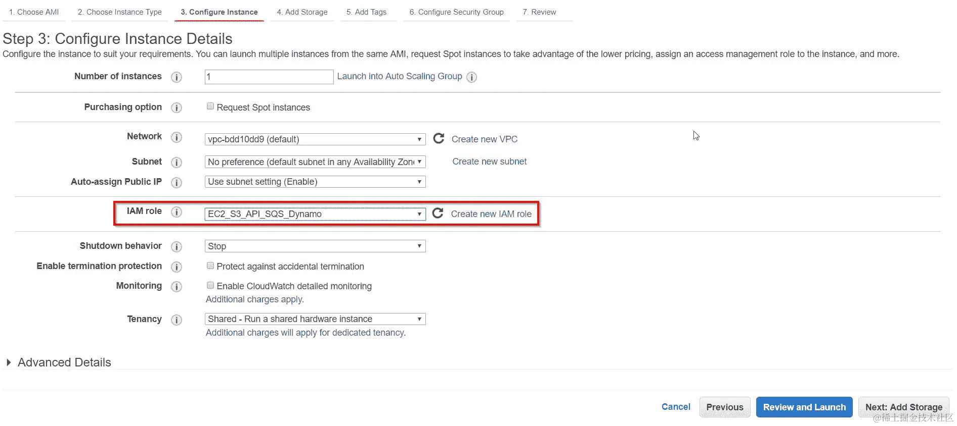 然后,我们再次点击下一步,然后我们进入最后一步,在这一步中我们可以设置角色名称,审查我们的配置,然后点击“创建角色”来创建一个新角色。为了我们的目的,我创建了一个名为EC2_S3_API_SQS_Dynamo的新角色:
