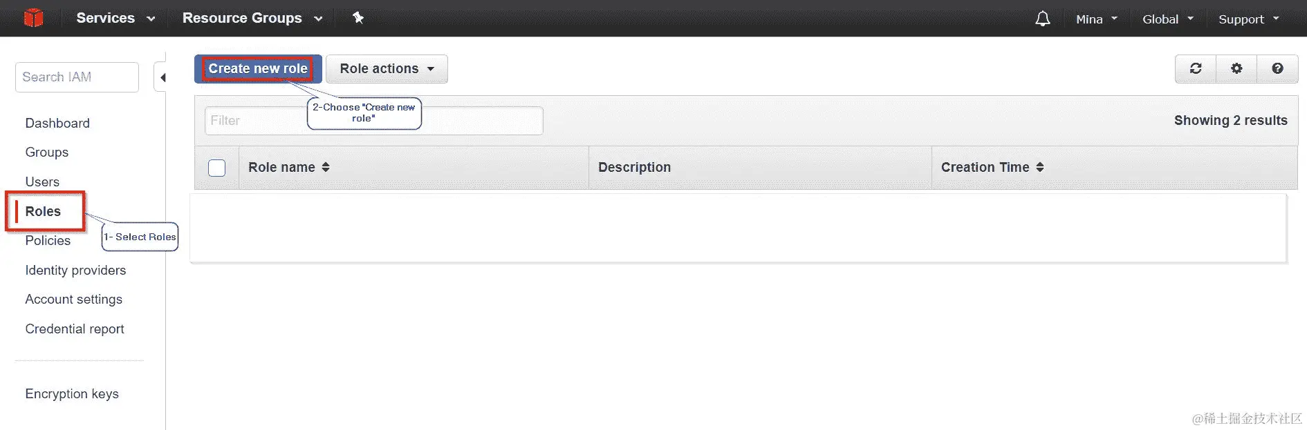 从那里,我们将走另一条路。这一次,我们点击右侧的“角色”,然后选择“创建新角色”:
