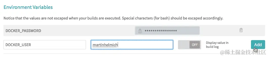 使用此功能配置您选择的容器注册表的凭据(如果您使用的是 Docker Hub 之外的注册表,请记得相应地调整前面构建作业中的docker login命令)。