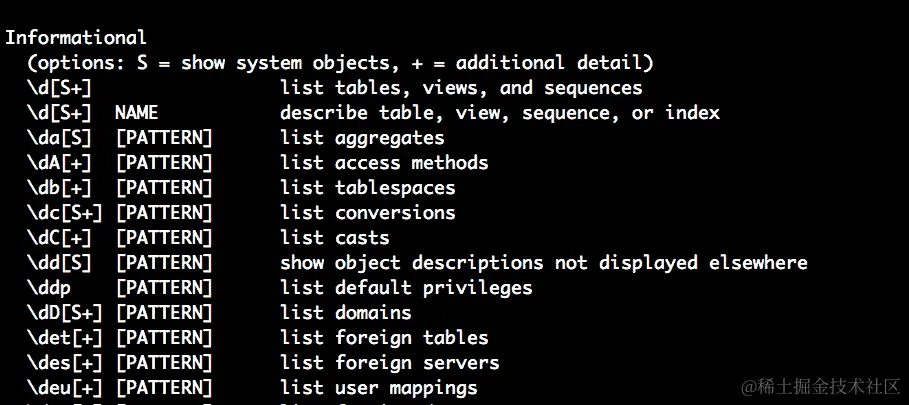 现在,它将我们转换为一个名为postgres的用户。然后,使用psql命令启动psql shell。如果在其中输入\?,您将看到所有可用命令的输出: