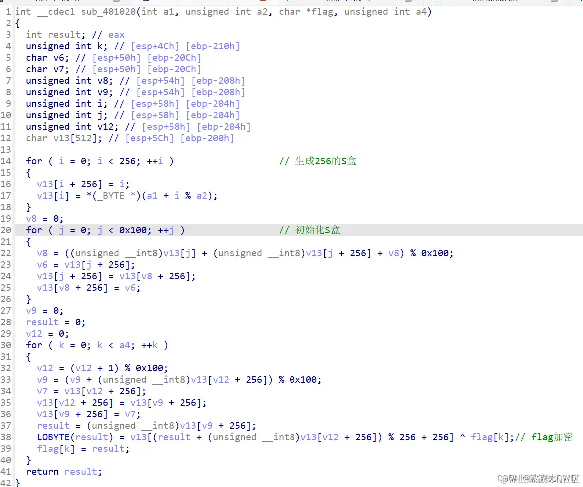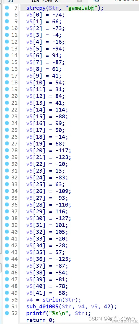 典型的RC4加密无疑,这里有两种方法进行逆向,第一种:可以在main函数中第52行打上断点,运行到这里后直接查看内存中的V5,即位flag。第二种:将需要的信息提取出来key=gamelab@,使用脚本进行解密: