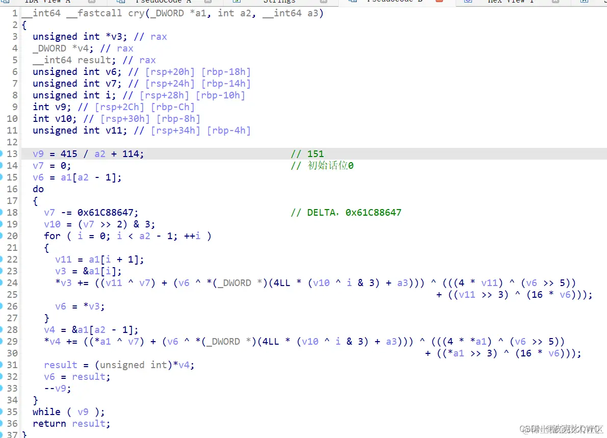 根据函数的特征,可以判定这是XXTEA加密无疑,找到其中的DELTA,密文(main函数中的v6),和key(前面main函数的V5),即可编写脚本解密(输出的时候注意大小端序):