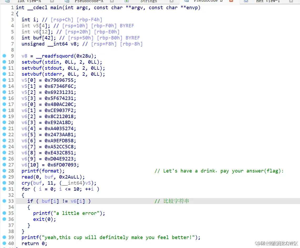 printf输出提示信息Let's have a drink,pay your answer(flag):,read在键盘读取flag输入,重要的关键函数是cry加密函数,接受v5和输入的flag,这里的11应该是flag被分割成了11组,最后一个循环比较加密后的flag和V6,刚好和上面v6数组对应: