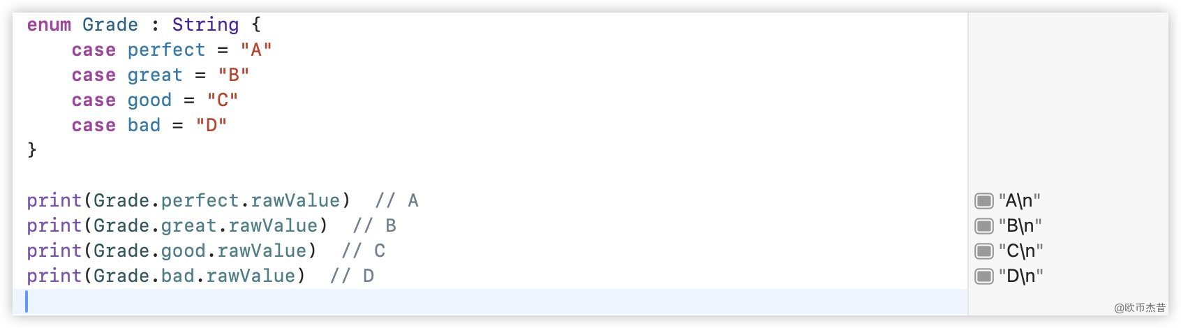 print(Grade.bad.rawValue) // D