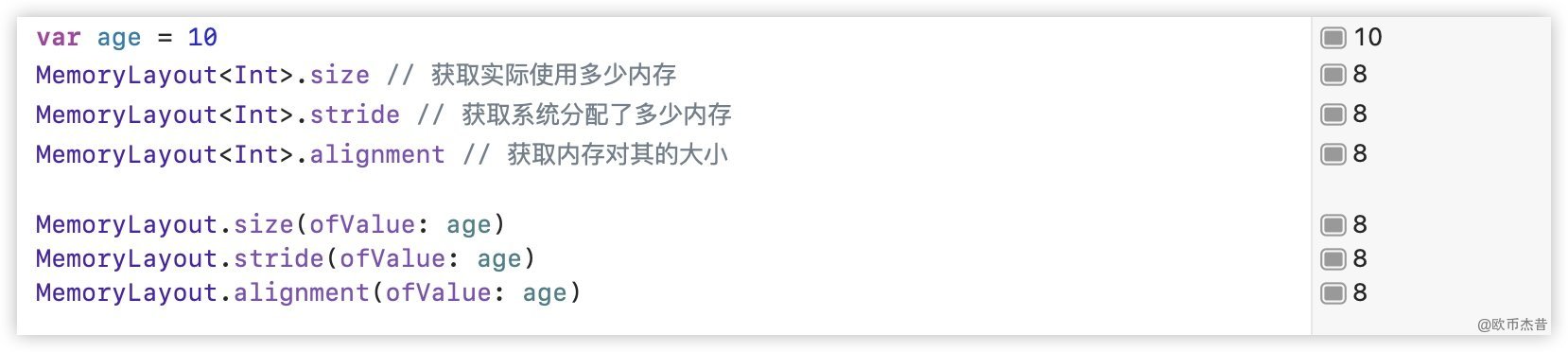 MemoryLayout<Int>.stride // 获取系统分配了多少内存