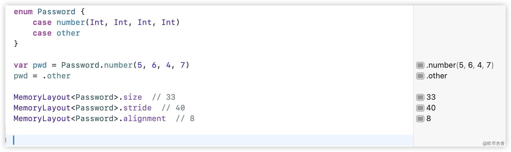 .size为33,是number(32字节)+other(1字节)。number是关联值类型,实际会把值存储到变量里去,所以这边需要32字节。但是如果把other一起存储在这32字节,就无法区分判断number、other,所以other单独分配了一个字节.stride为40,是因为内存对其,实际使用了33字节,对其后就是40