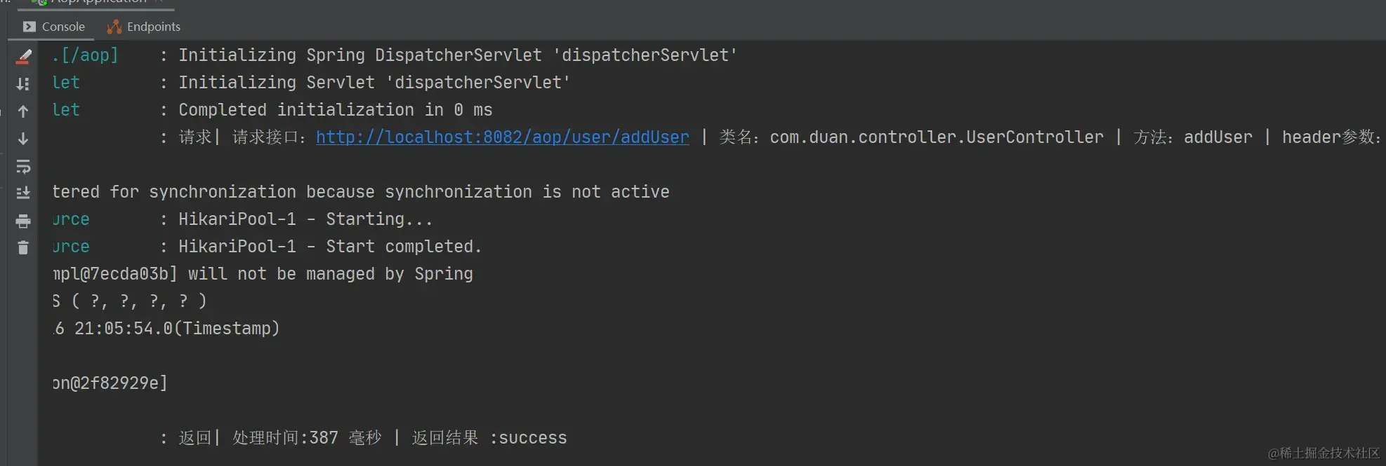 获得业务中的增删改方法的操作日志,一般都保存到数据库中,现在我们是测试,就先不保存到数据库,直接打印出来,包含请求的接口地址、操作时间、执行方法全类名、执行方法名、方法参数、返回值、方法执行时长。