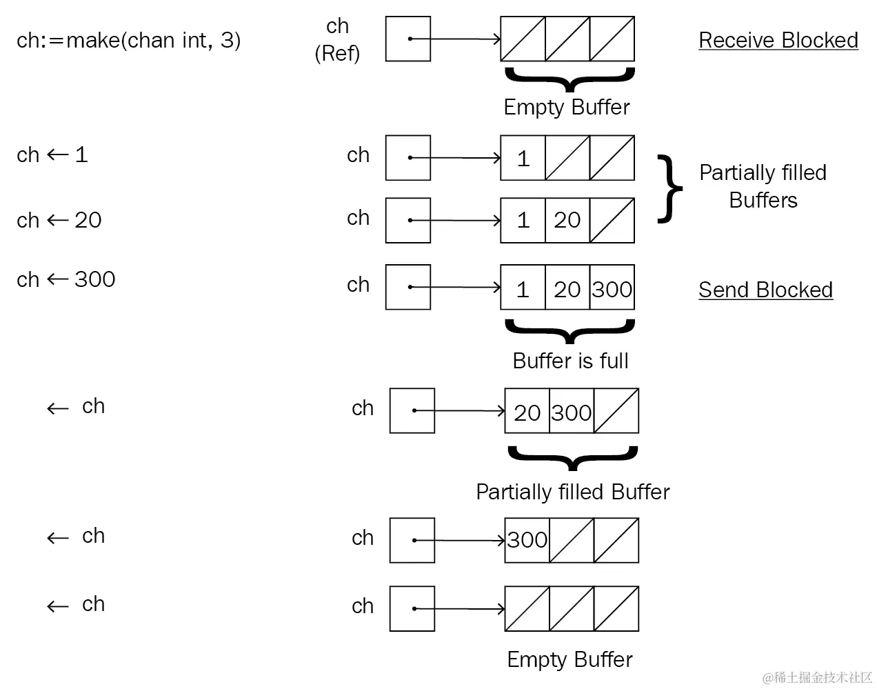 - 对于缓冲通道,接收消息的顺序不是保证的。