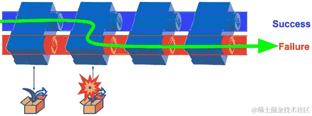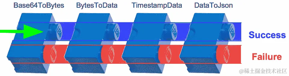 请注意,我们不会抛出异常(或恐慌);相反,我们将我们的应用程序流从Success路径移动到Failure路径。实际上,这意味着在执行可能在我们的代码中失败的每个命令后,我们不再需要检查错误。使用单子模式,我们能够将程序流重定向到Failure路径,并在尾端处理这个执行链中的所有错误。
