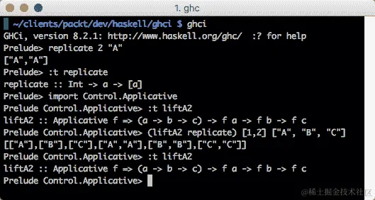 请看下面的终端控制台,这是使用提升操作(liftA2)将replicate函数转换为包装类型的示例。我们使用applicative style,因为我们正在使用任意数量的参数进行提升。