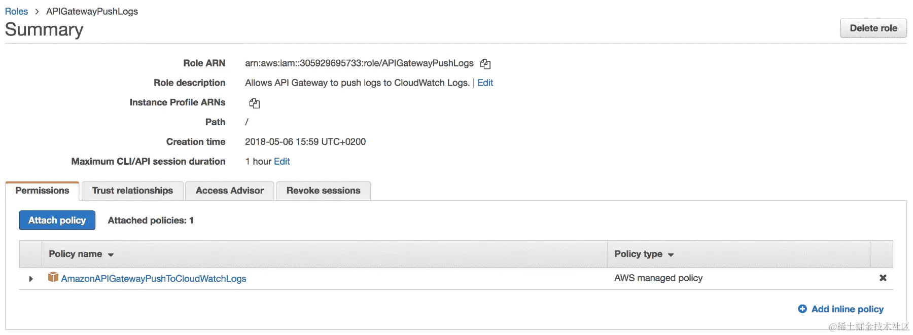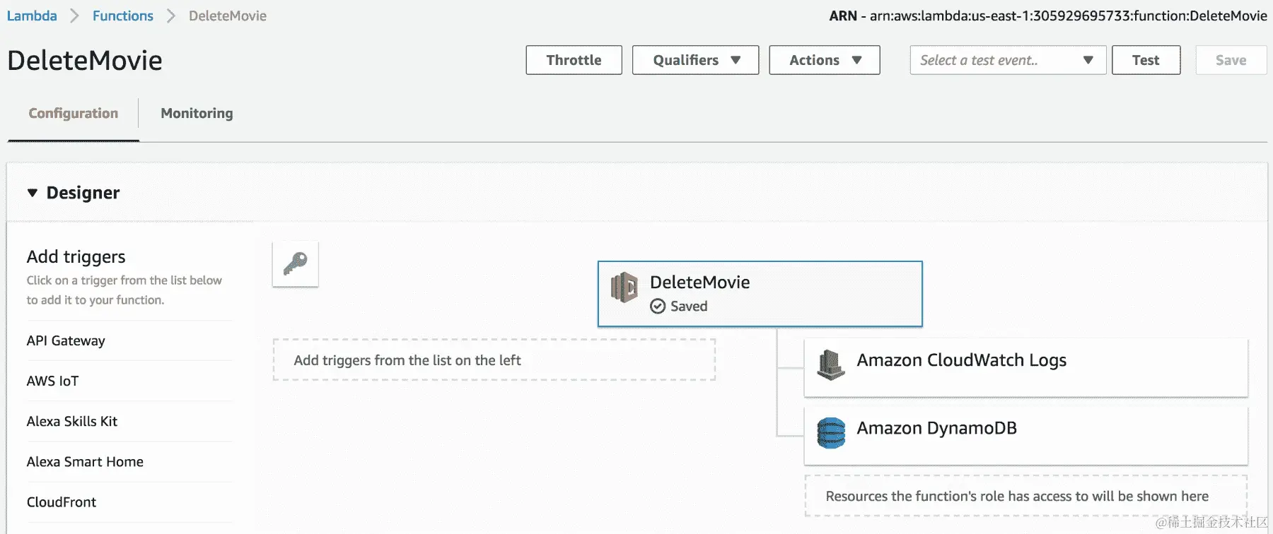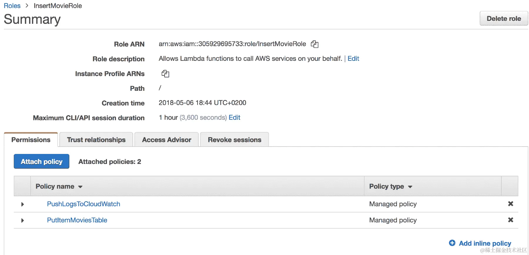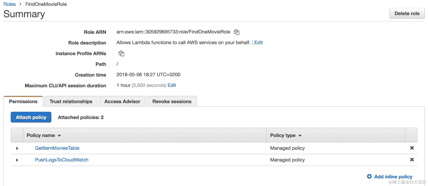 DeleteMovieRole的新 IAM 角色,该角色具有将日志推送到 CloudWatch 并在电影表上调用DeleteItem操作的权限,如下截图所示: