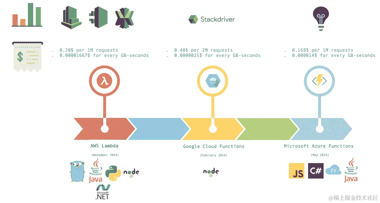 亚马逊在 2014 年推出了 AWS Lambda,开启了无服务器革命,随后是微软 Azure Functions 和 Google Cloud Functions。