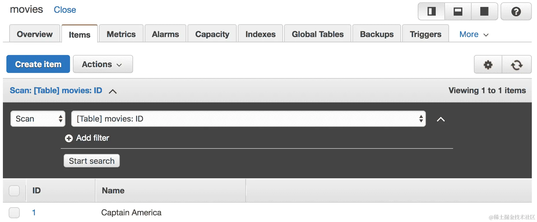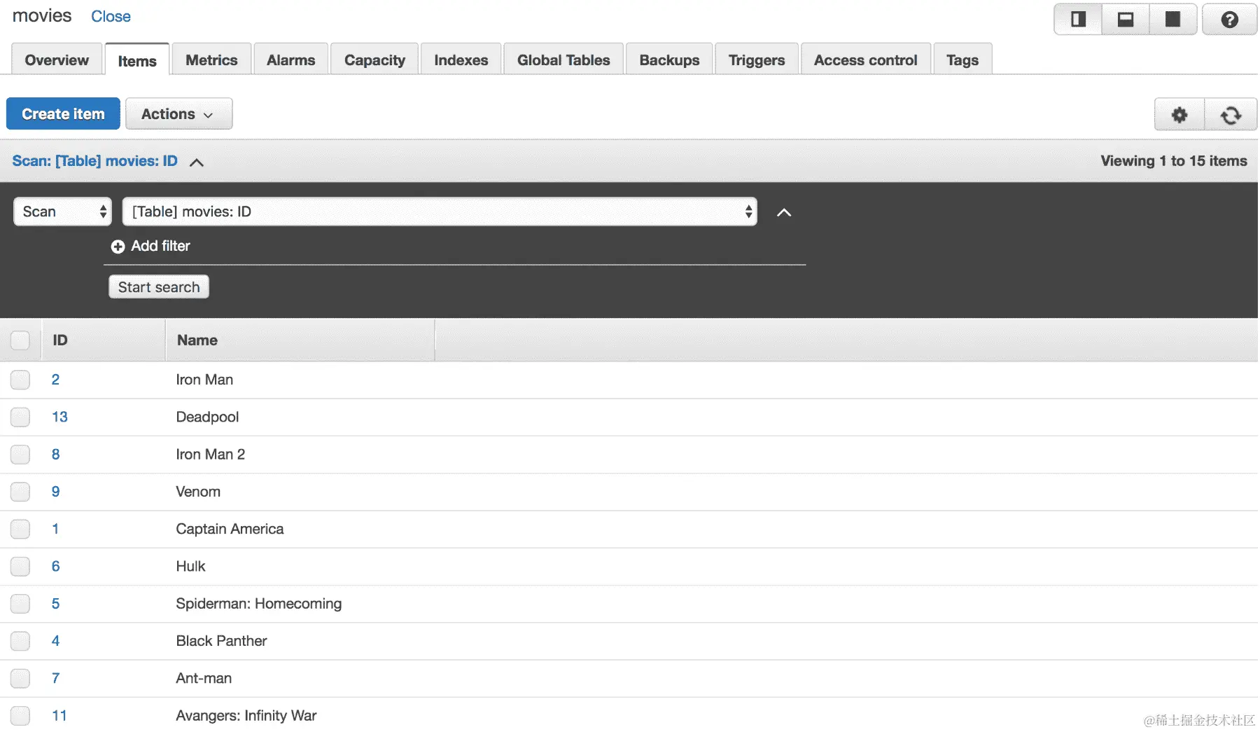 - ID 为 1 的电影不会出现在返回的列表中。您可以在 DynamoDB 控制台中验证电影已成功删除,如下所示: