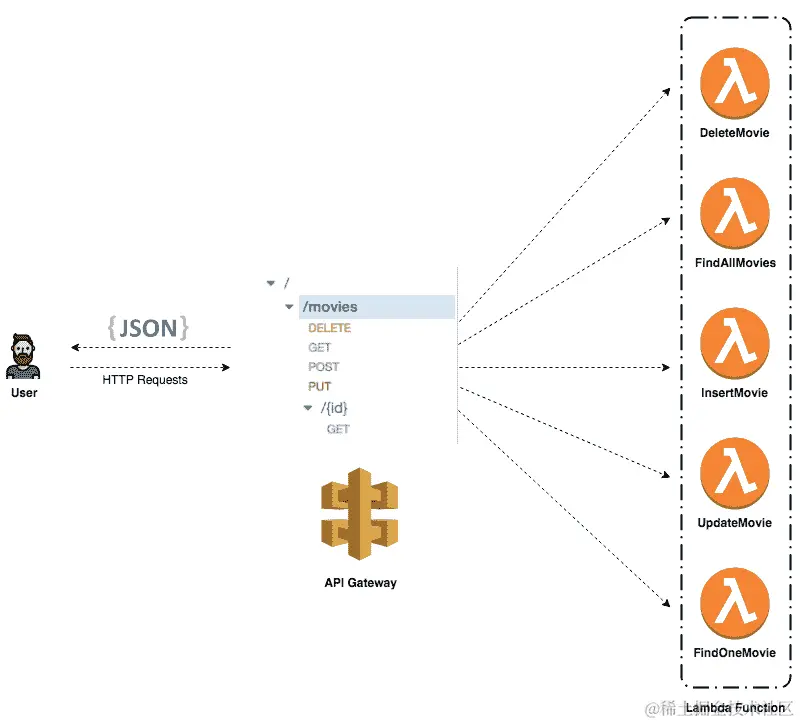 实现一个单一的 Lambda 函数来处理所有类型的事件(GET,POST,DELETE,PUT)。