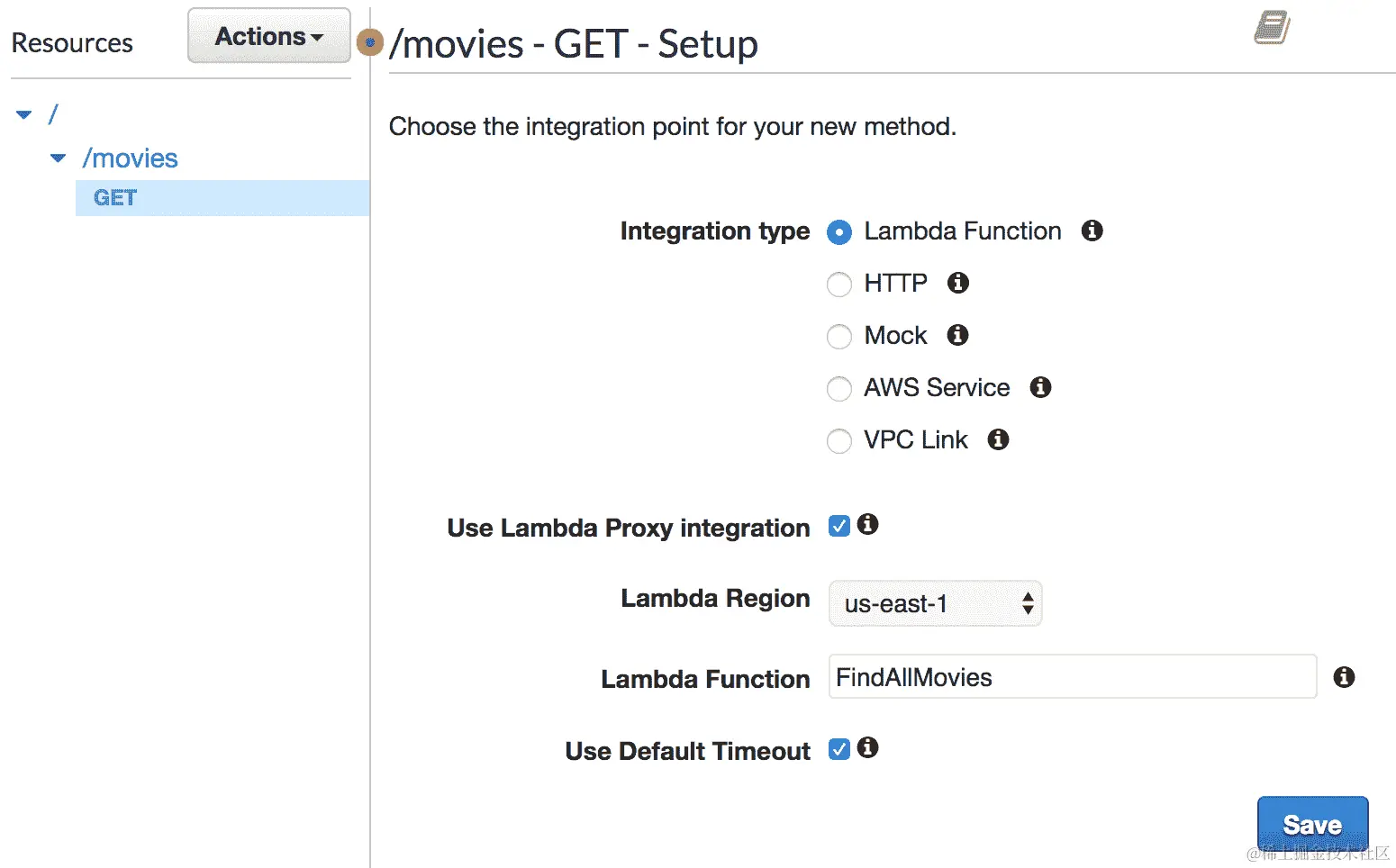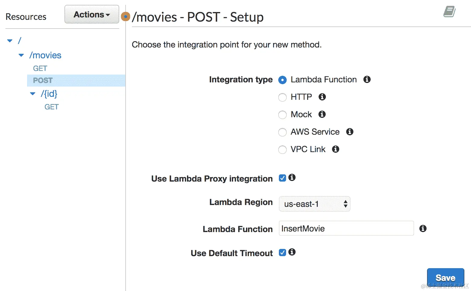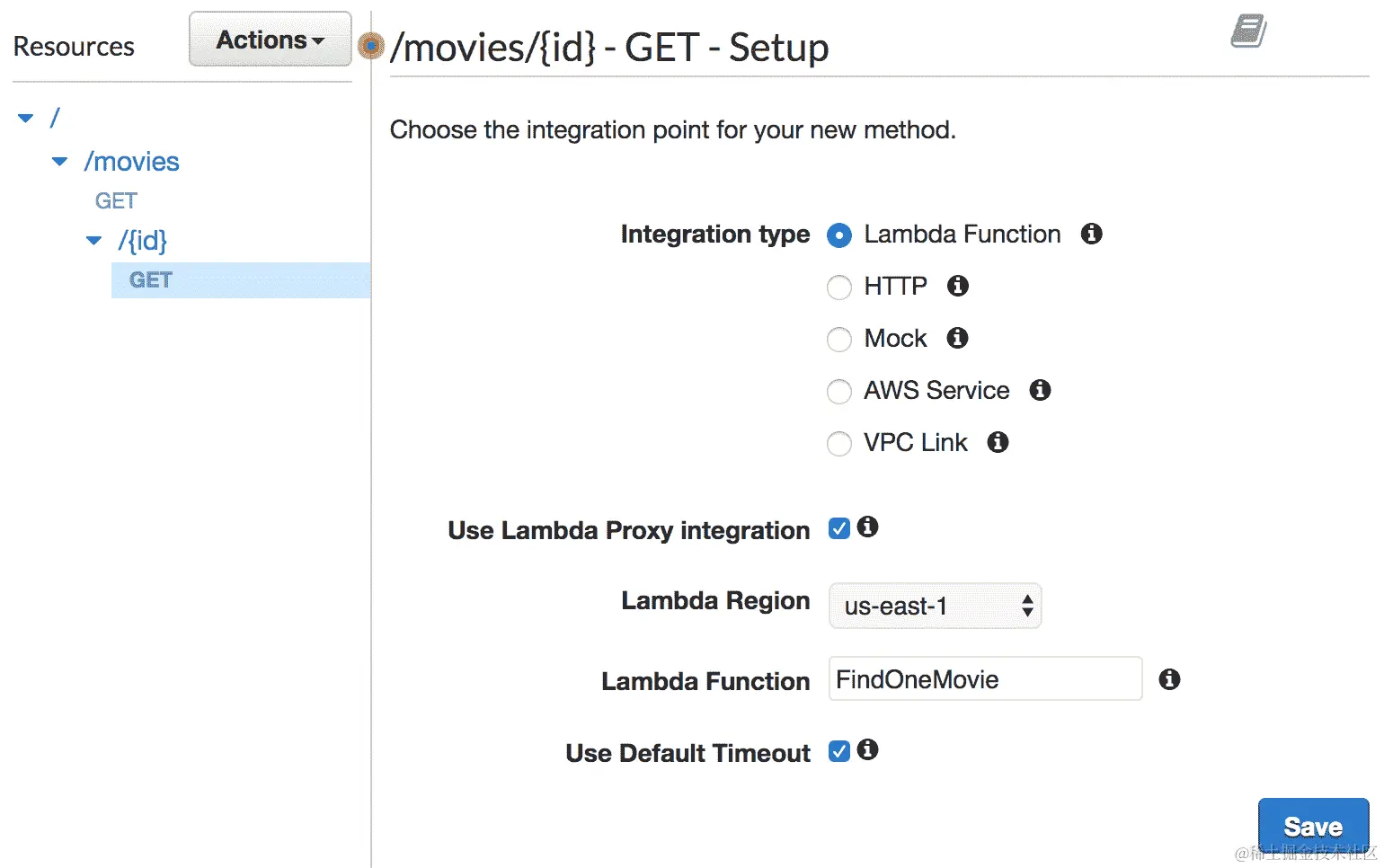 /movies端点上公开一个DELETE方法。为此,我们不会使用 API Gateway 控制台,而是使用 AWS CLI,以便您熟悉它。 -