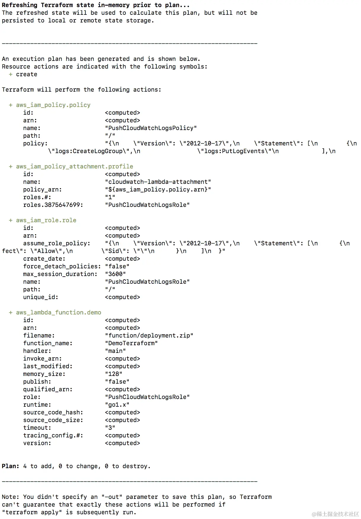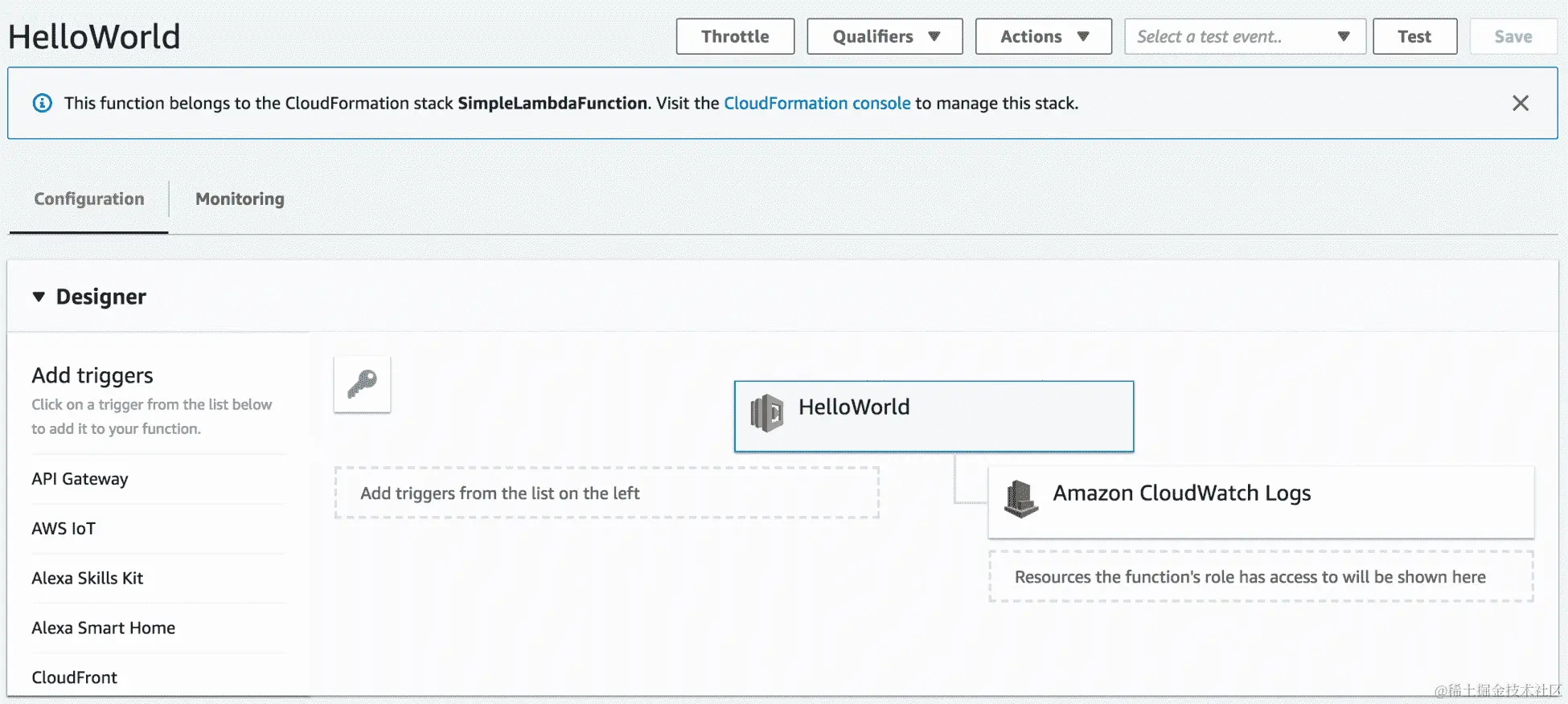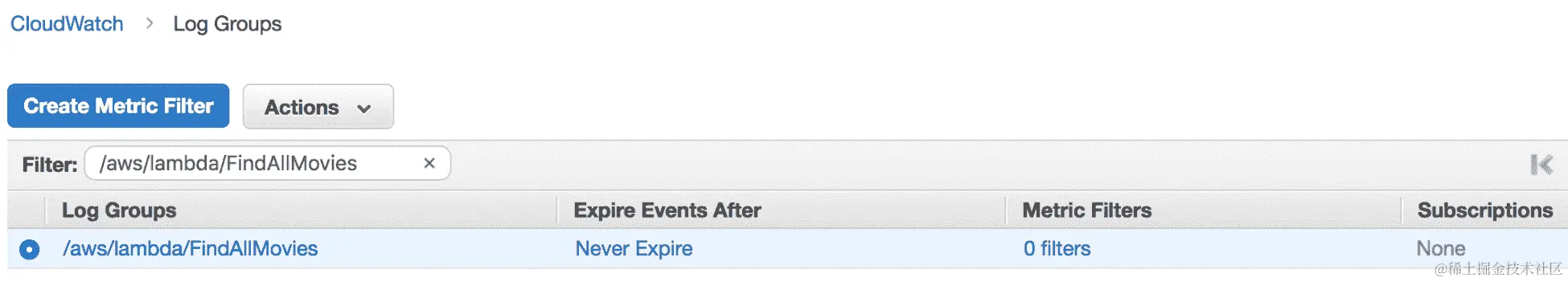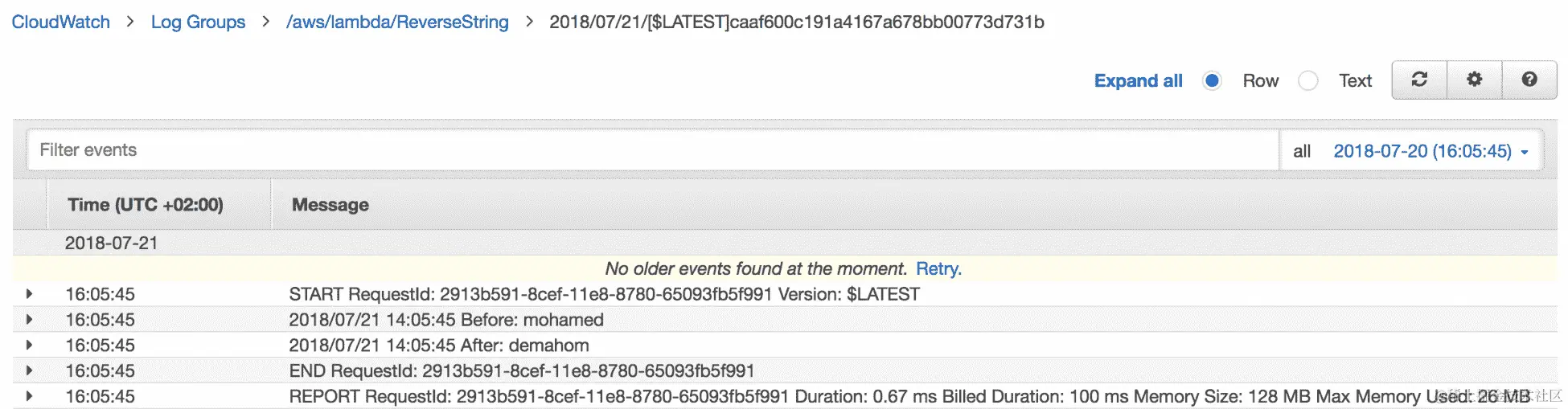 然后,您可以将函数部署到 AWS Lambda,并从 AWS 控制台或使用invoke命令调用它。Lambda 会自动集成到 Amazon CloudWatch 日志,并将代码中的所有日志推送到与 Lambda 函数关联的 CloudWatch 日志组: