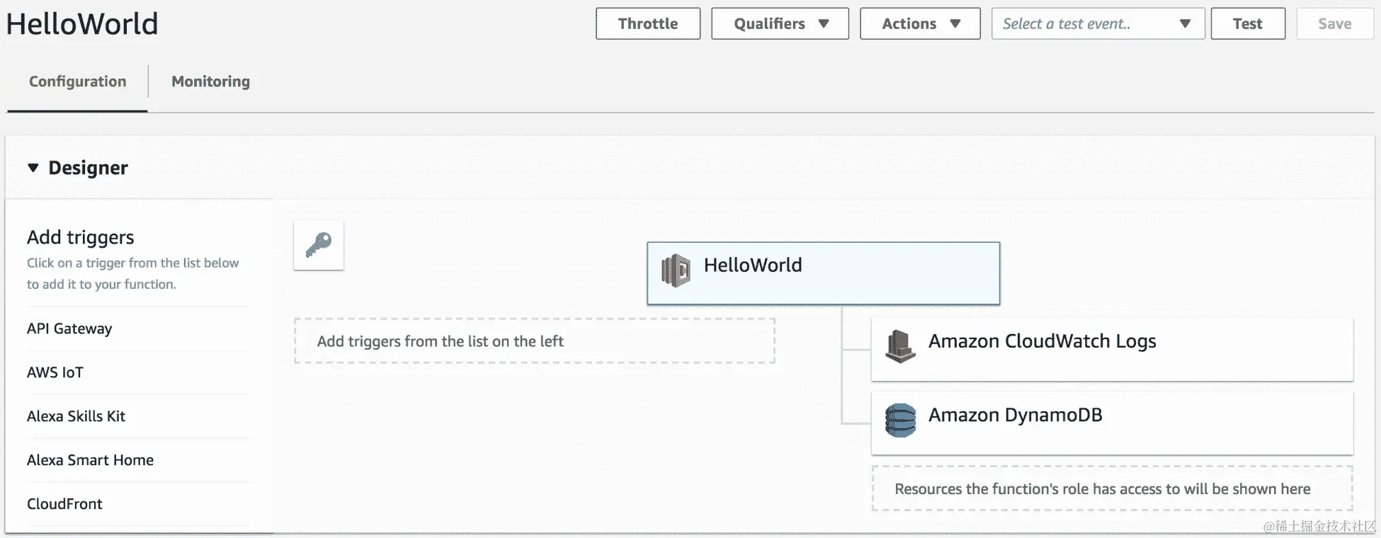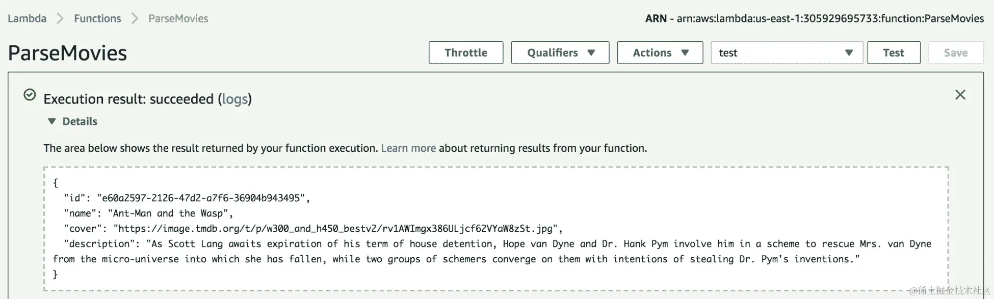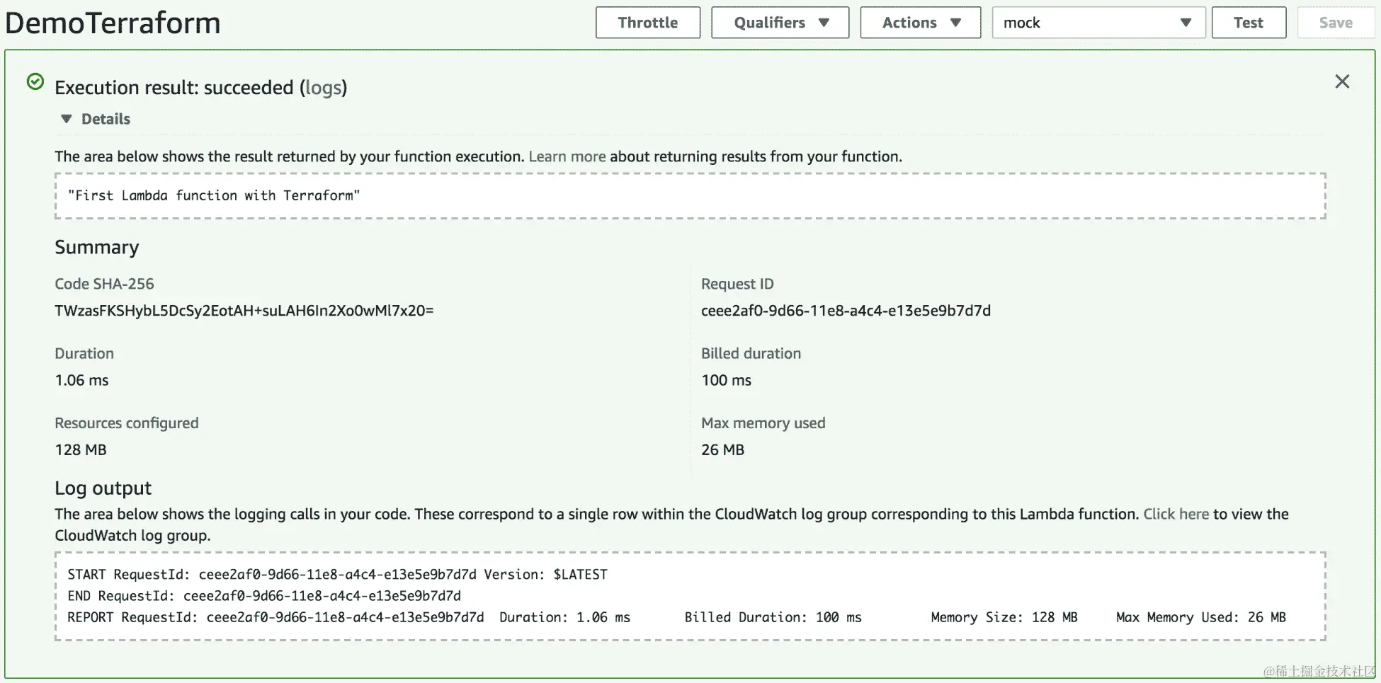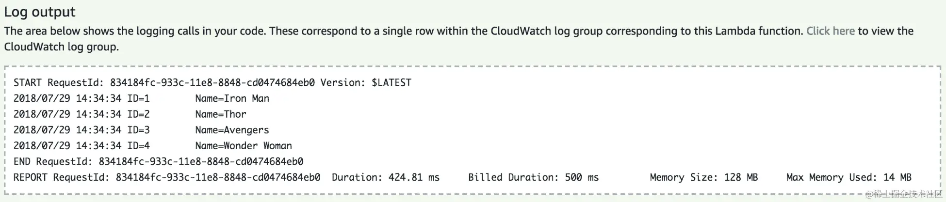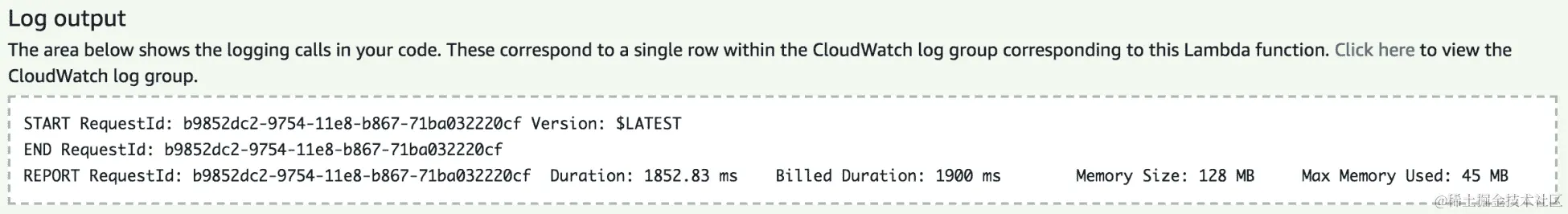默认情况下,每次通过 Lambda 控制台调用函数时,它都会报告有关函数资源使用情况、执行持续时间以及计费时间的关键信息: