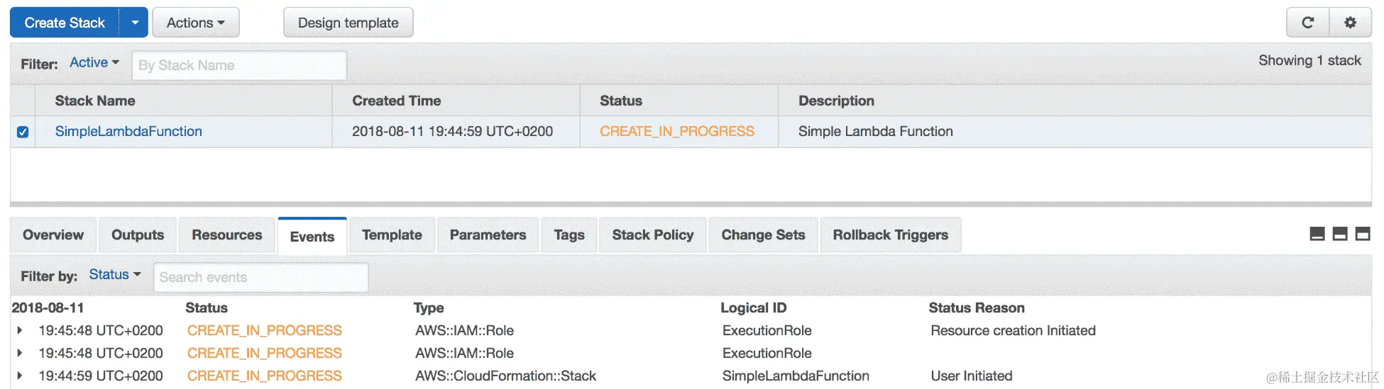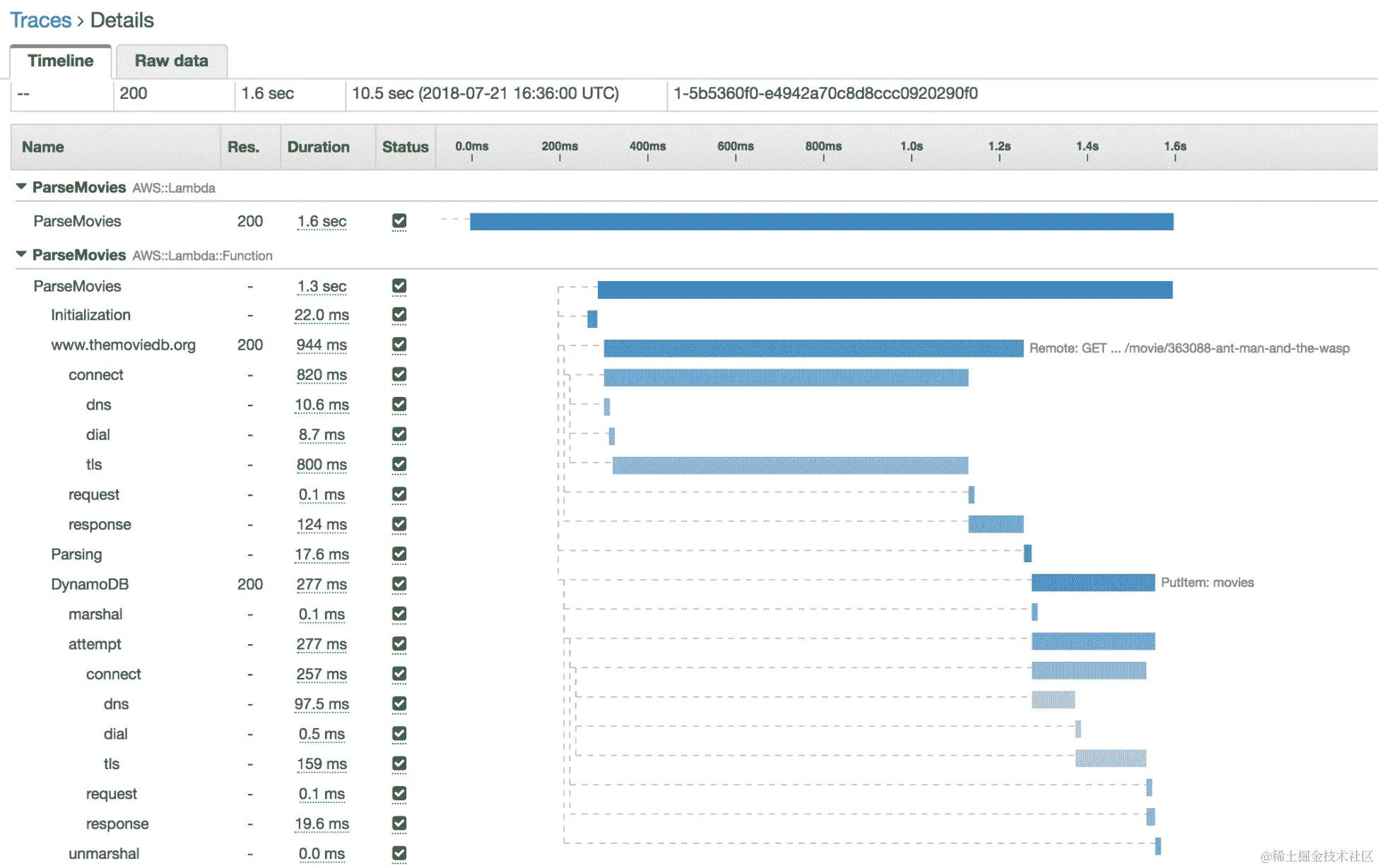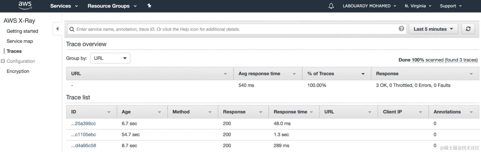 接下来,转到 AWS X-Ray 控制台,单击“跟踪”,多次调用 Lambda 函数,并刷新页面。将在跟踪列表中添加新行。对于每个跟踪,您将获得代码响应和执行时间: