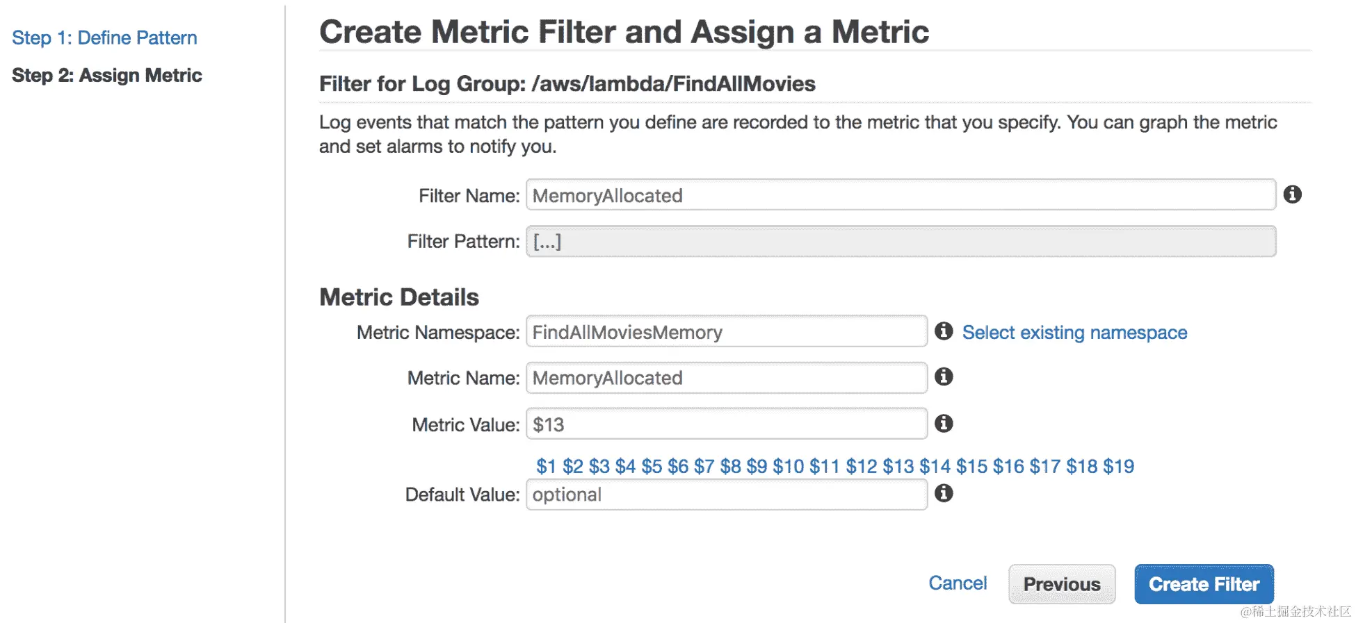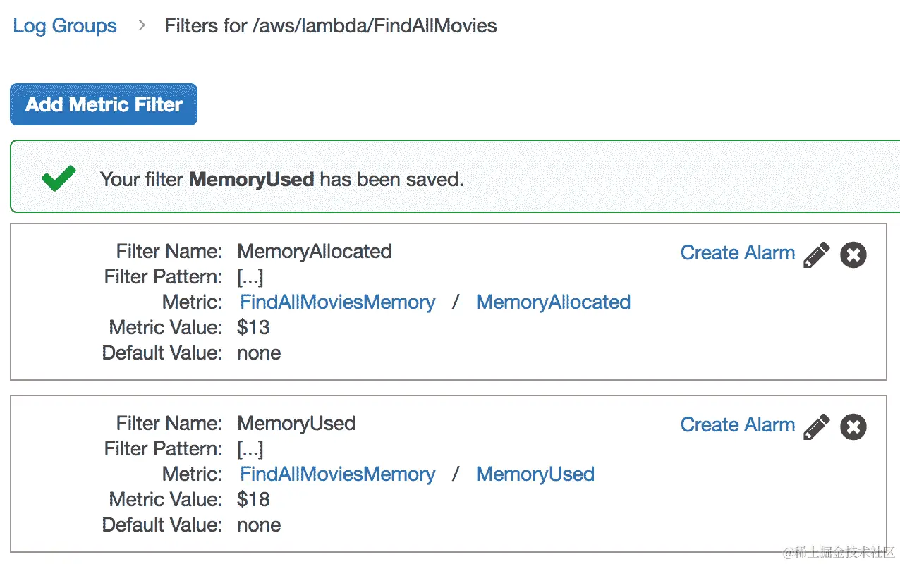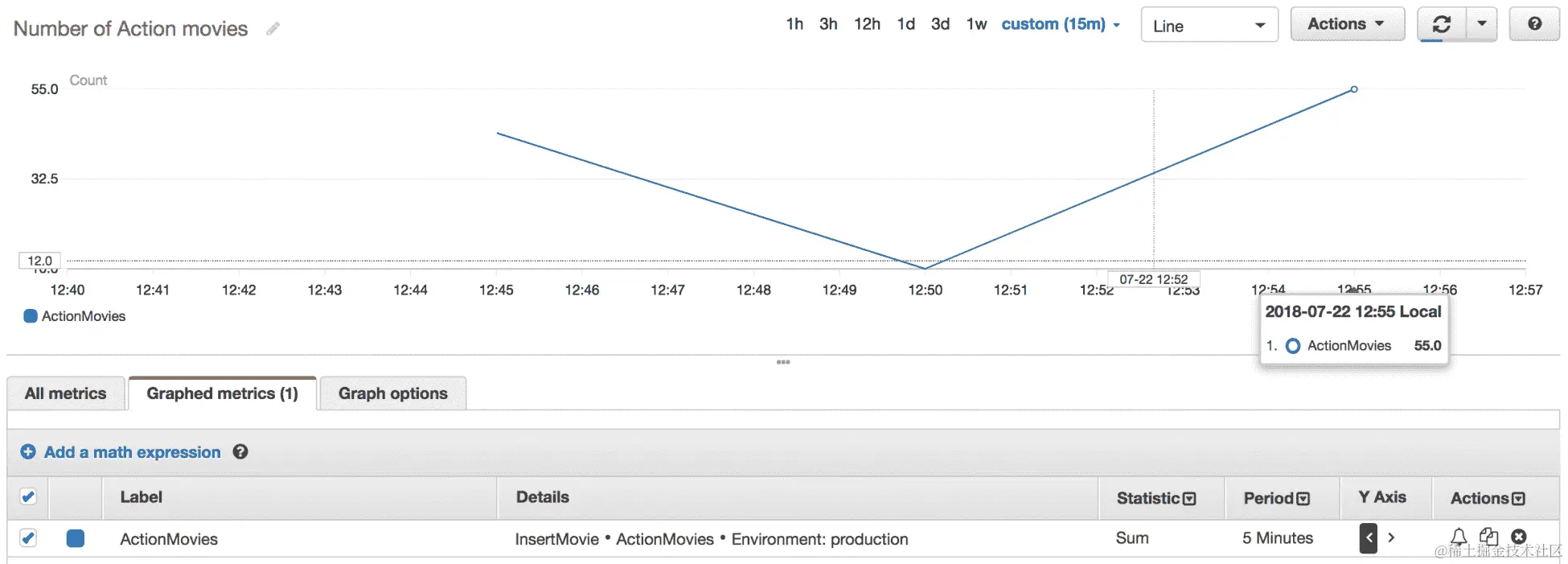 此外,您还可以使用 CloudWatch Golang SDK 创建自定义指标并将其发布到 CloudWatch。以下代码片段是使用 CloudWatch SDK 发布自定义指标的 Lambda 函数。该指标表示插入到 DynamoDB 中的Action电影的数量(为简洁起见,某些部分被省略):