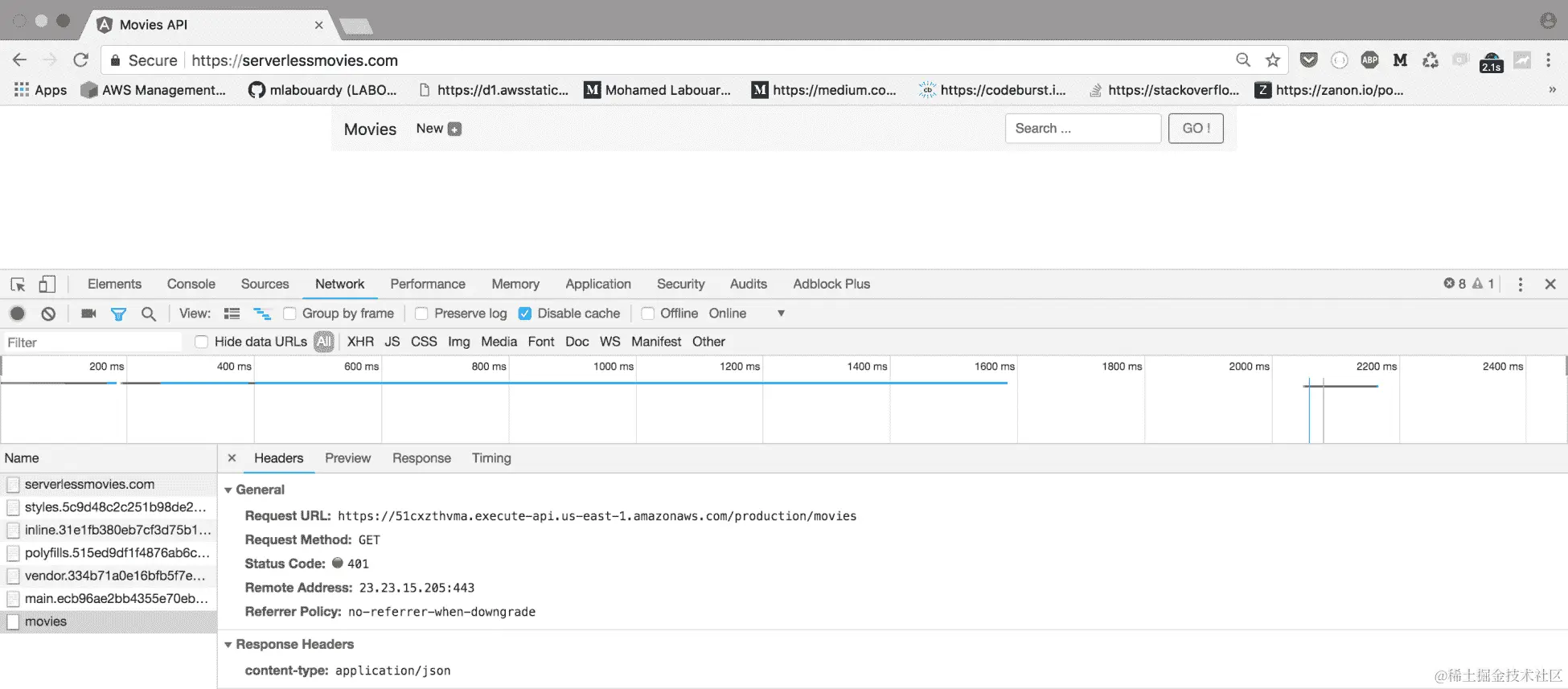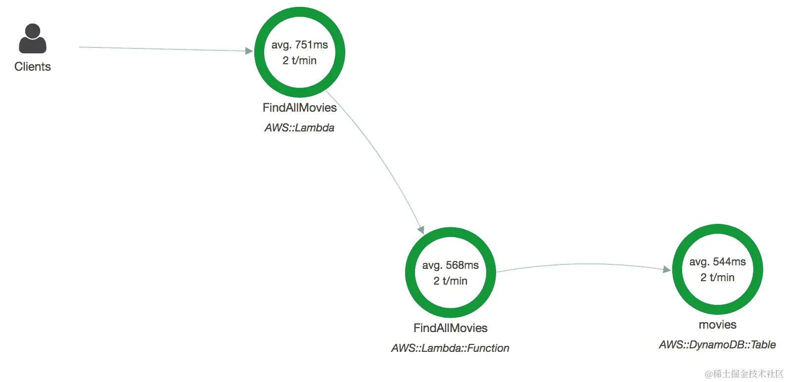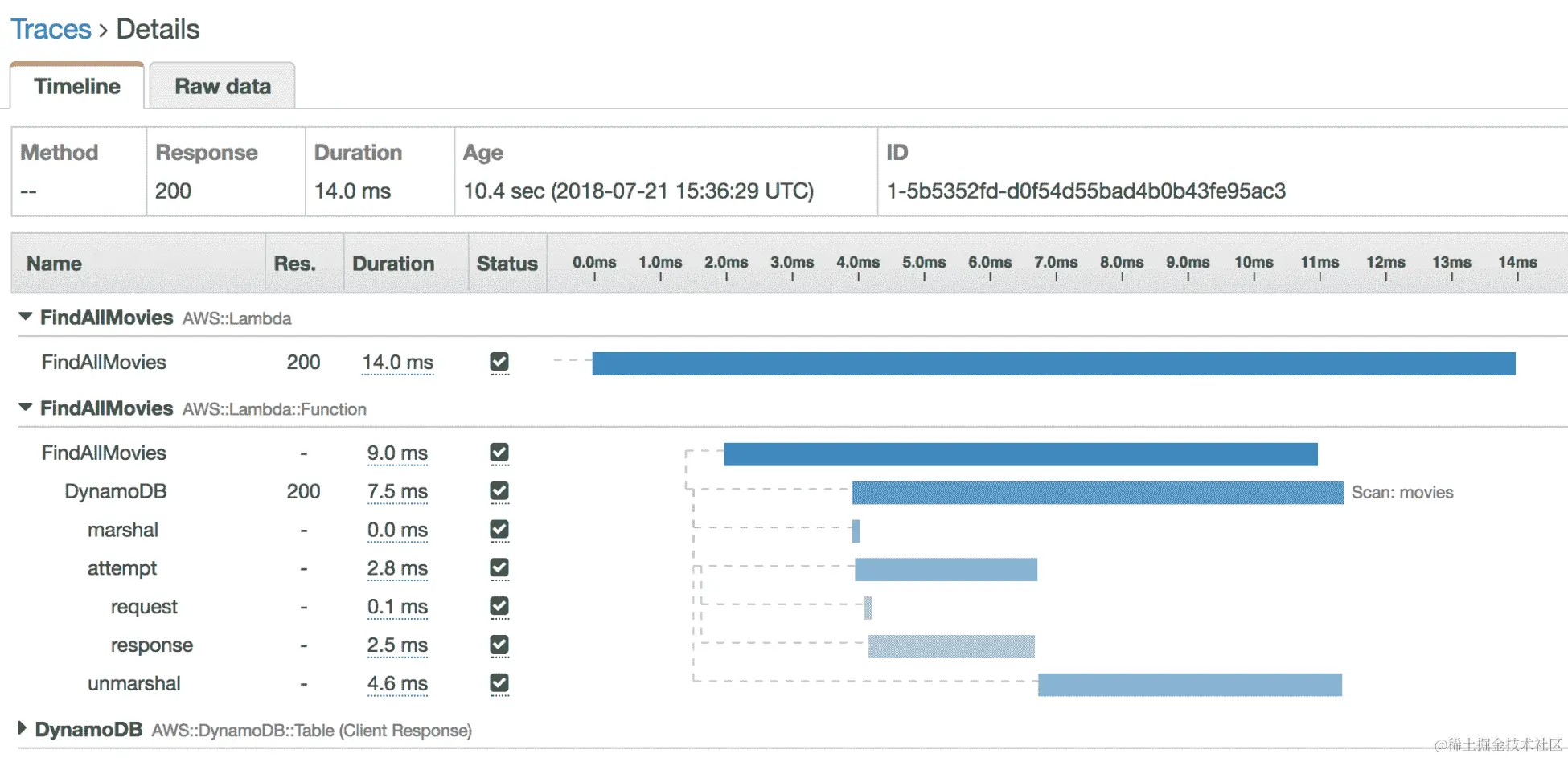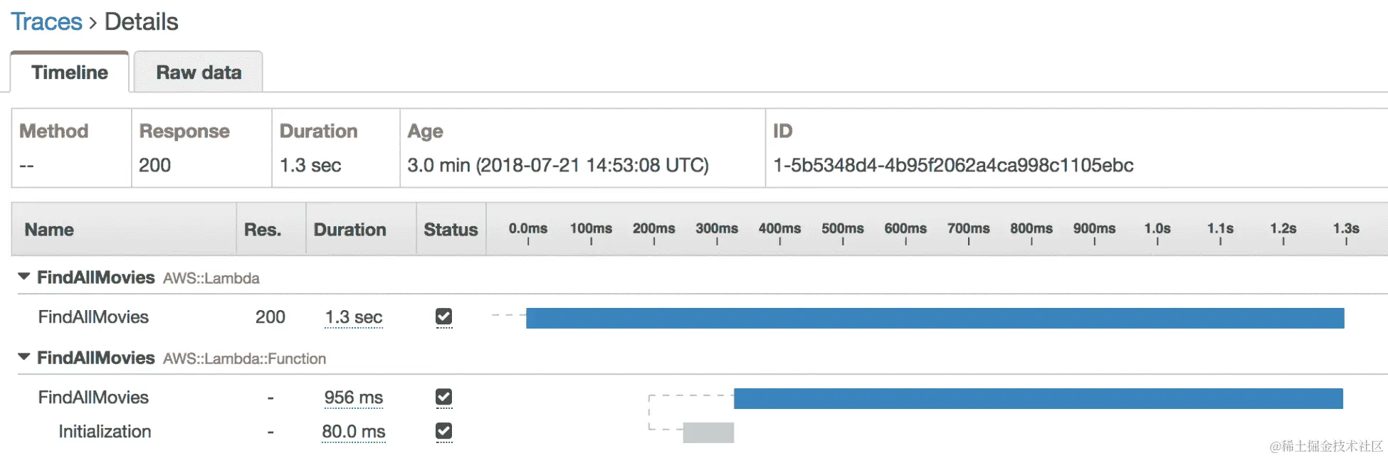 这是FindAllMovies函数的跟踪;它包括 Lambda 初始化函数所需的时间: