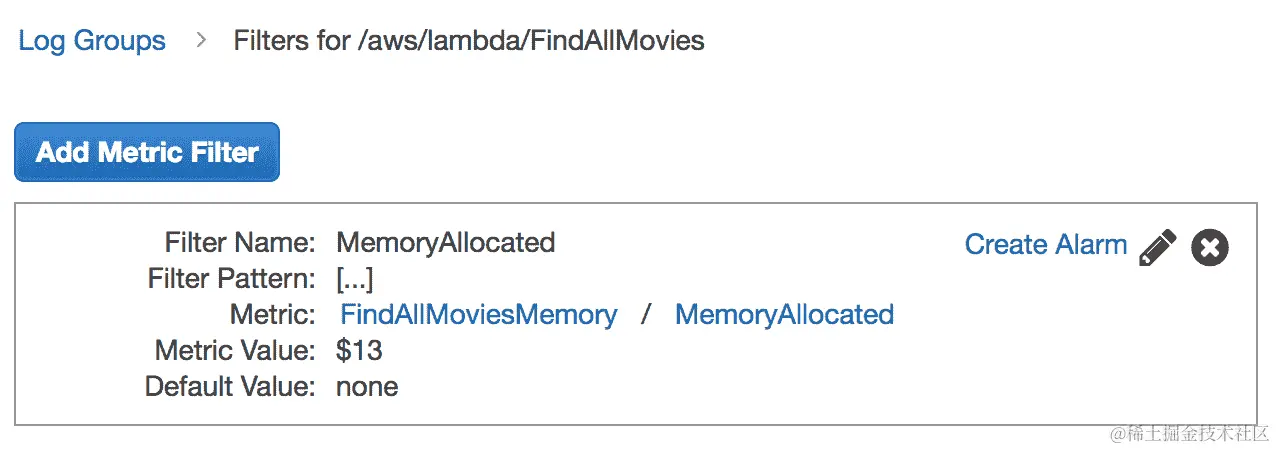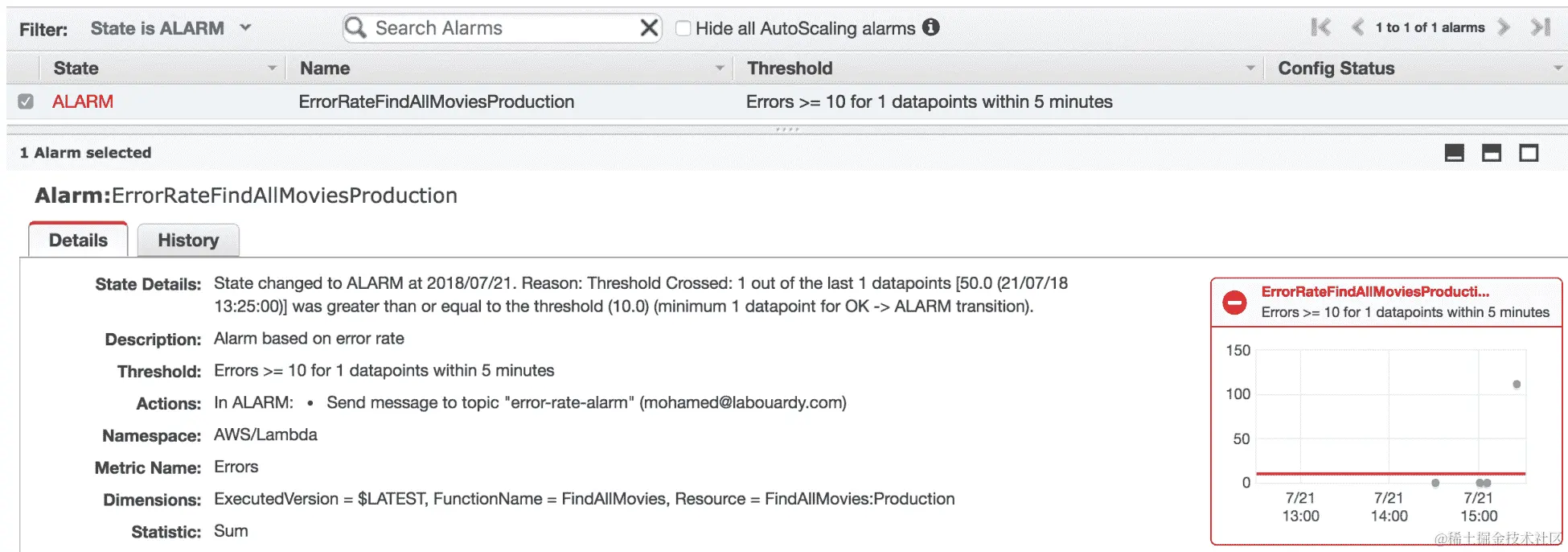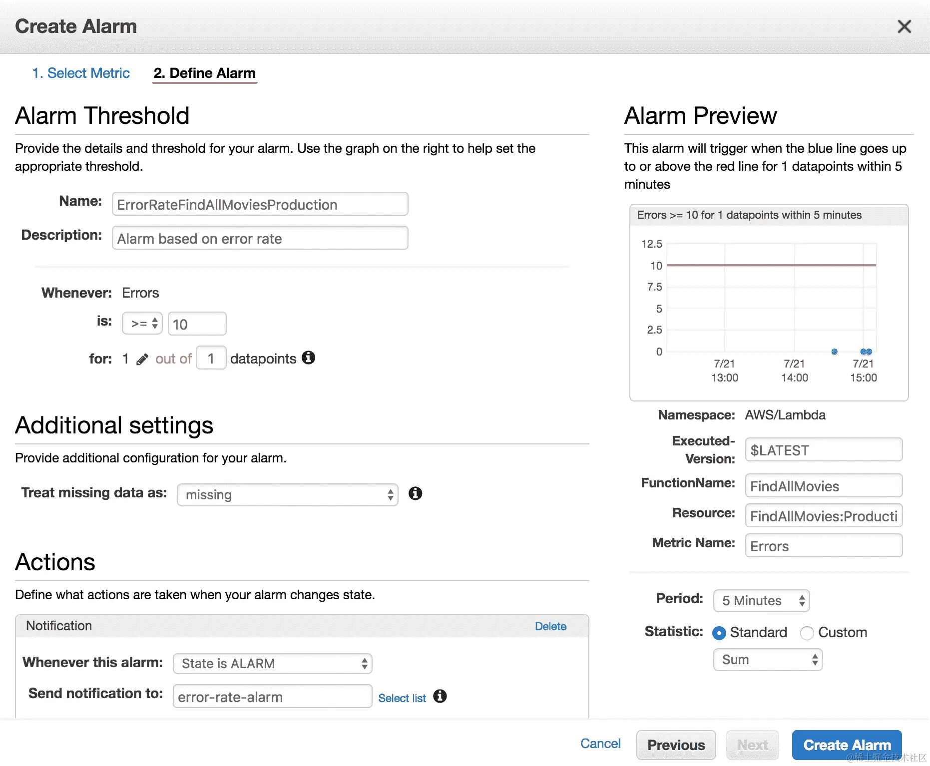 CloudWatch 允许您在发生意外行为时基于可用指标创建警报。在以下示例中,我们将基于FindAllMovies函数的错误率创建警报: