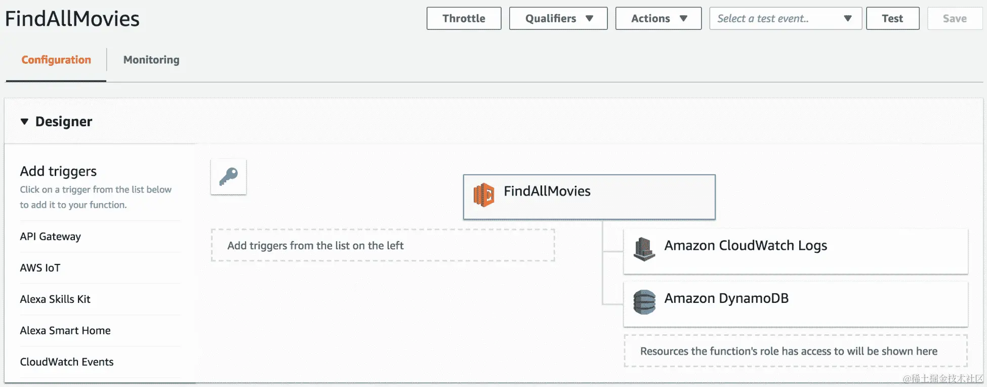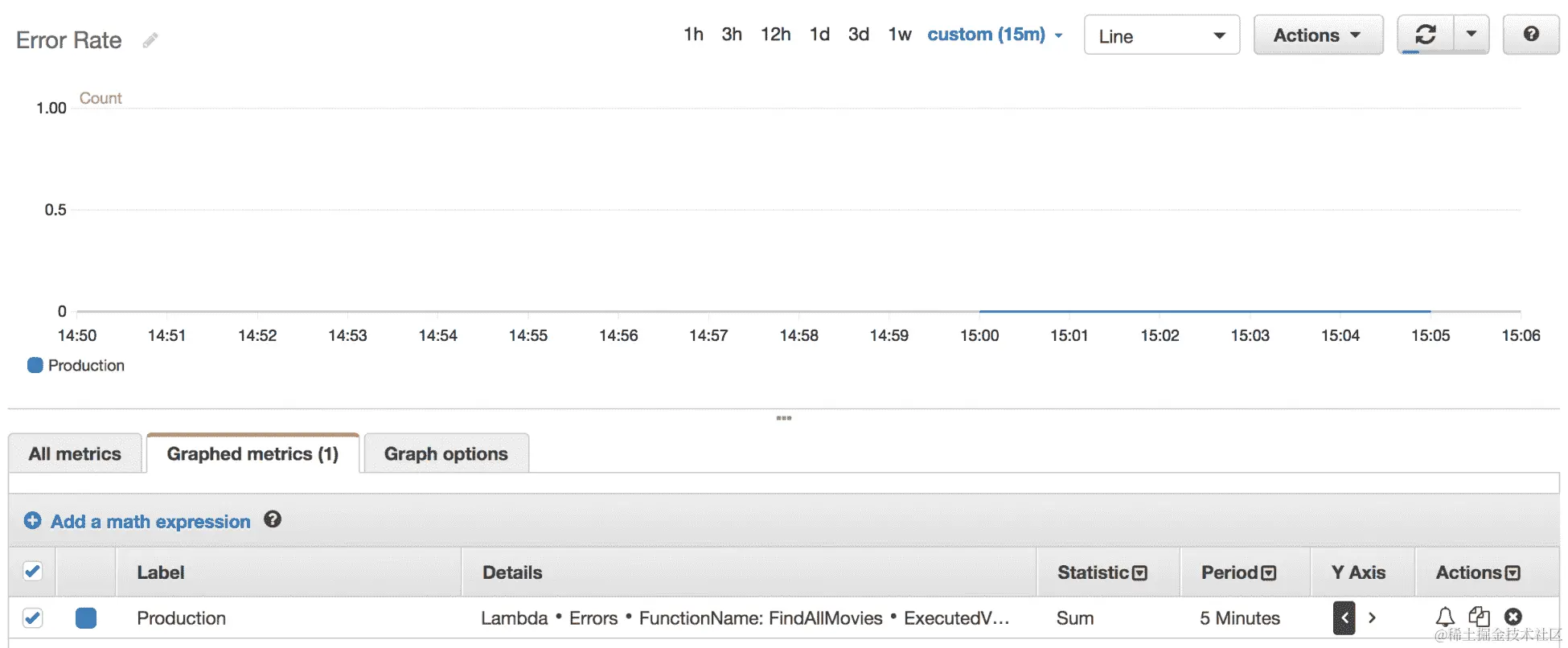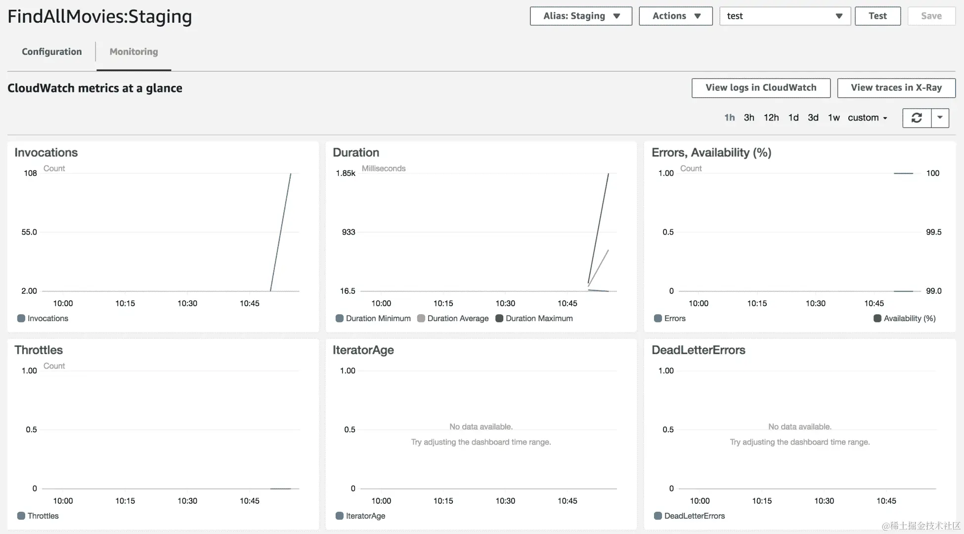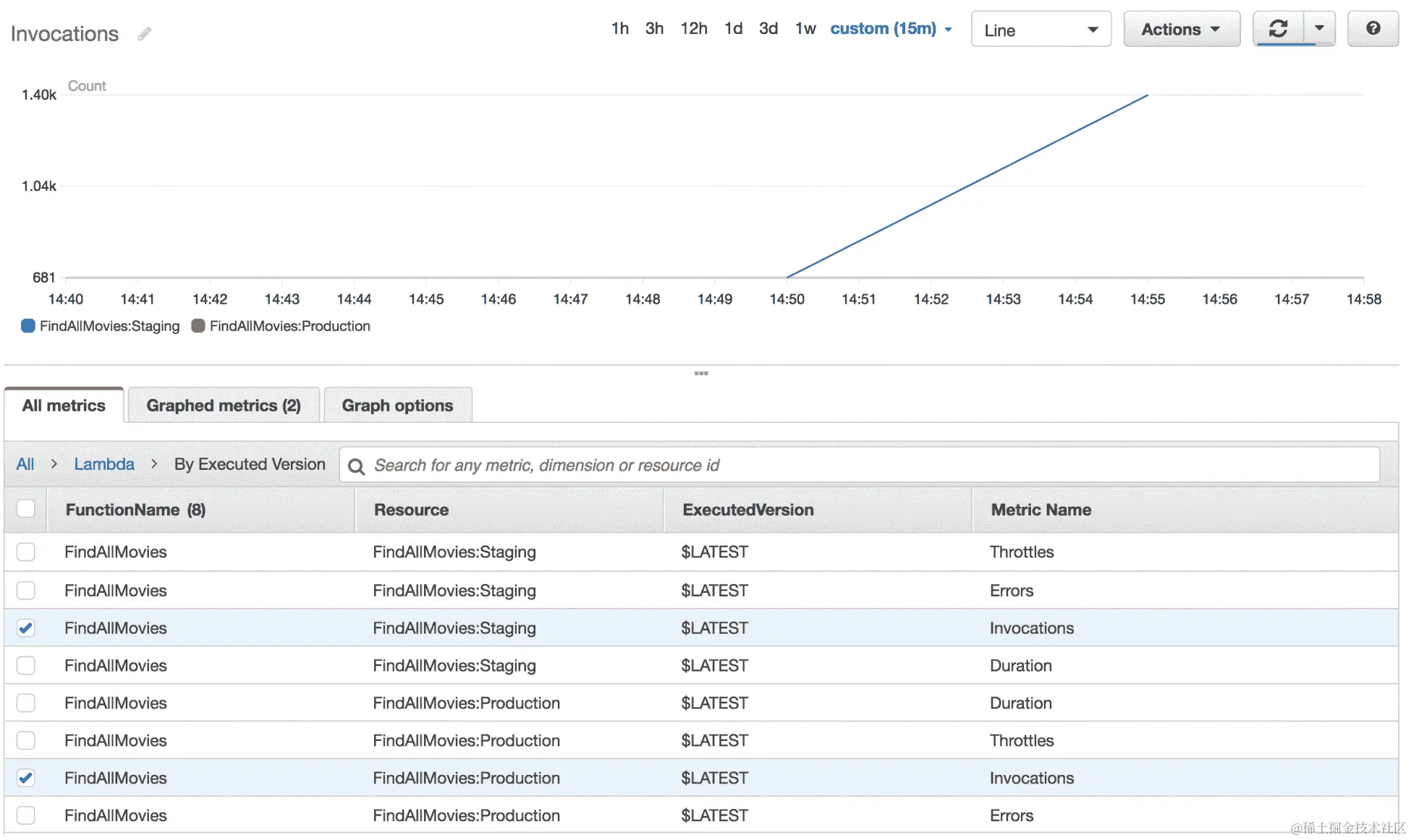 前面的图表表示在过去 15 分钟内production和staging别名的FindAllMovies函数的调用次数。您可以进一步创建自定义图表。这使您可以为 Lambda 函数构建自定义仪表板。它将概述负载(您可能会遇到的任何问题)、成本和其他重要指标。