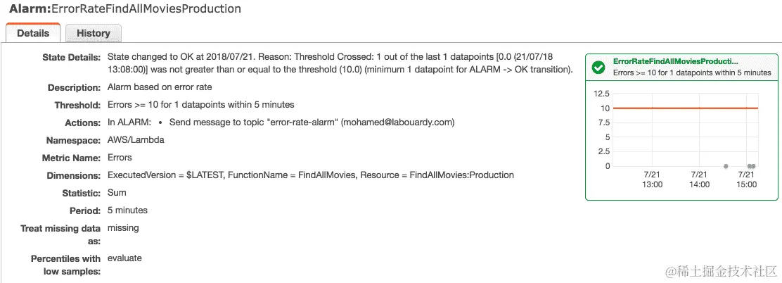 一旦确认,每当 Lambda 函数的错误率超过定义的阈值时,警报将从“正常”状态更改为“警报”状态: