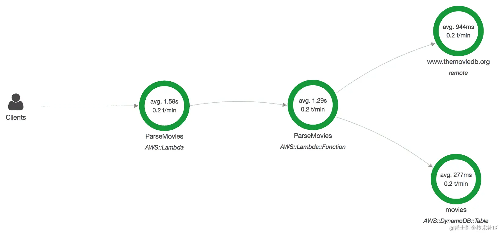 AWS X-Ray 是 AWS 管理的服务,允许您跟踪 Lambda 函数发出的传入和传出请求。它将这些信息收集在段中,并使用元数据记录附加数据,以帮助您调试、分析和优化函数。