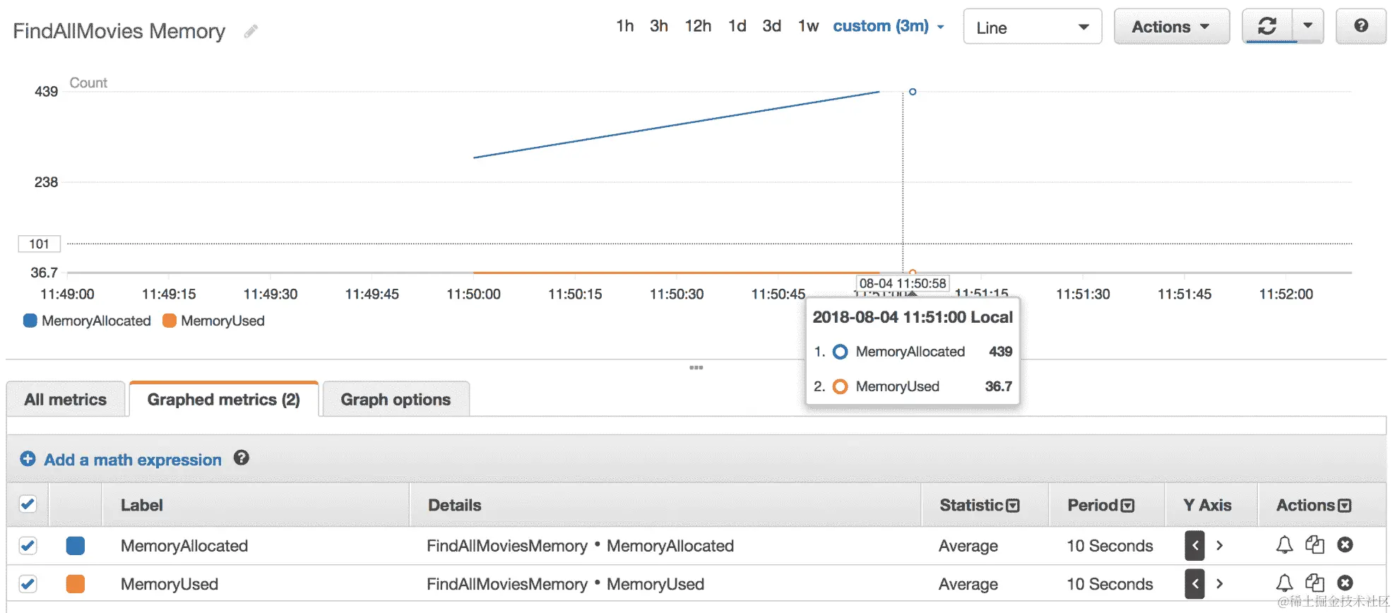 该指标由名称、命名空间、维度列表(名称-值对)、值和度量单位唯一定义。在您向 CloudWatch 发布了一些值之后,您可以使用 CloudWatch 控制台查看统计图表: