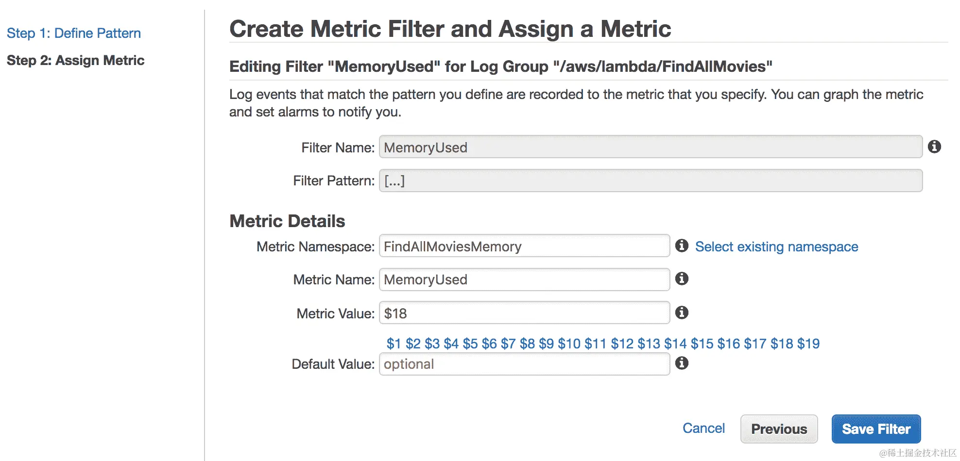 为了实现这一点,请点击“操作”列中的铃铛图标。然后,填写以下字段以设置一个警报,如果在五分钟内错误数量超过10,则会触发警报。一旦触发警报,将使用简单通知服务(SNS)发送电子邮件: