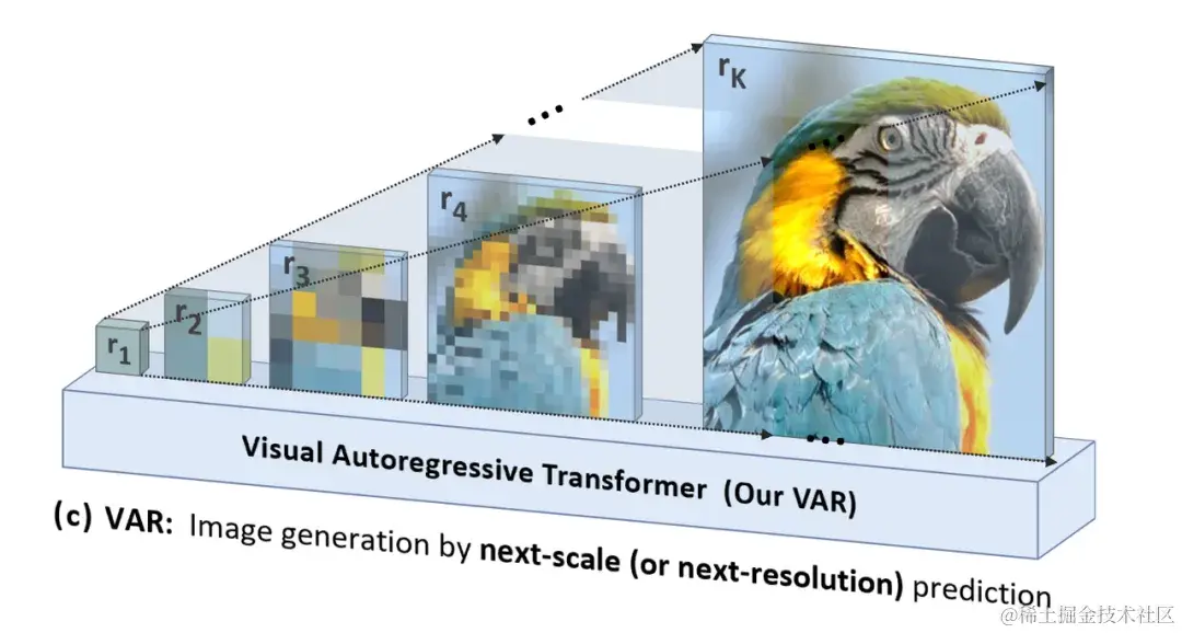 VAR正是借鉴了这种由粗到细的多尺度思路,定义图像的自回归顺序为"下一个更高分辨率的token图谱预测",而非传统的"下一个token预测"。具体来说,VAR首先使用多尺度量化自编码器(VQVAE)将图像编码为不同分辨率的离散token图谱,然后训练一个自回归Transformer,从最低分辨率的1x1图谱开始,逐步预测出更高分辨率的token图谱。