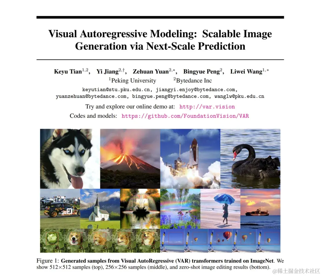 来自北京大学和字节跳动的研究团队,提出了一种名为"Visual AutoRegressive (VAR) Modeling"的全新视觉生成范式。VAR 重新定义了图像的自回归学习过程,从而使得GPT风格的自回归模型首次超越扩散模型,在图像生成质量、速度和可扩展性等多方面都取得了突破性进展。