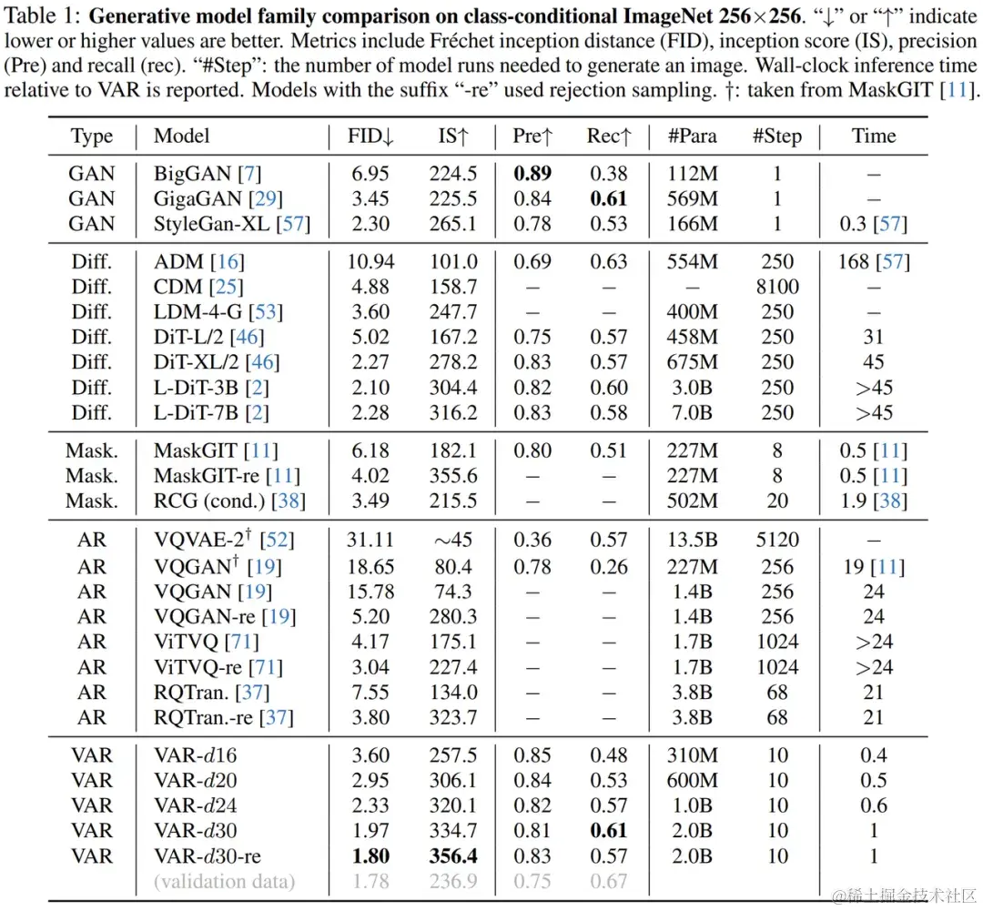 - 在图像质量指标上,VAR取得了FID 1.80、IS 356.4的SOTA水平,大幅超越了之前自回归模型的表现。