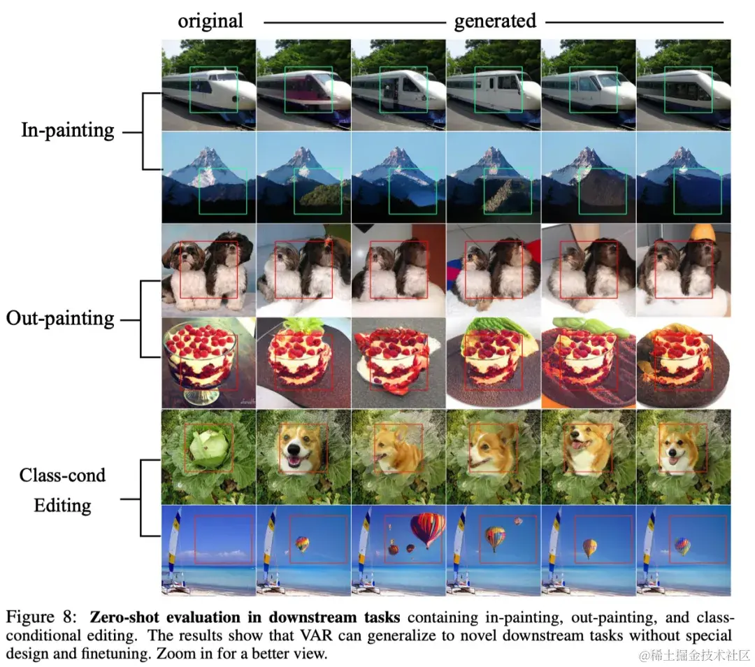 VAR还展现出了在一些下游任务上的零样本泛化能力,包括图像补全、外插和类条件编辑等。这表明VAR具有从自身任务迁移到新任务的潜力,与LLM的零样本学习能力相似。