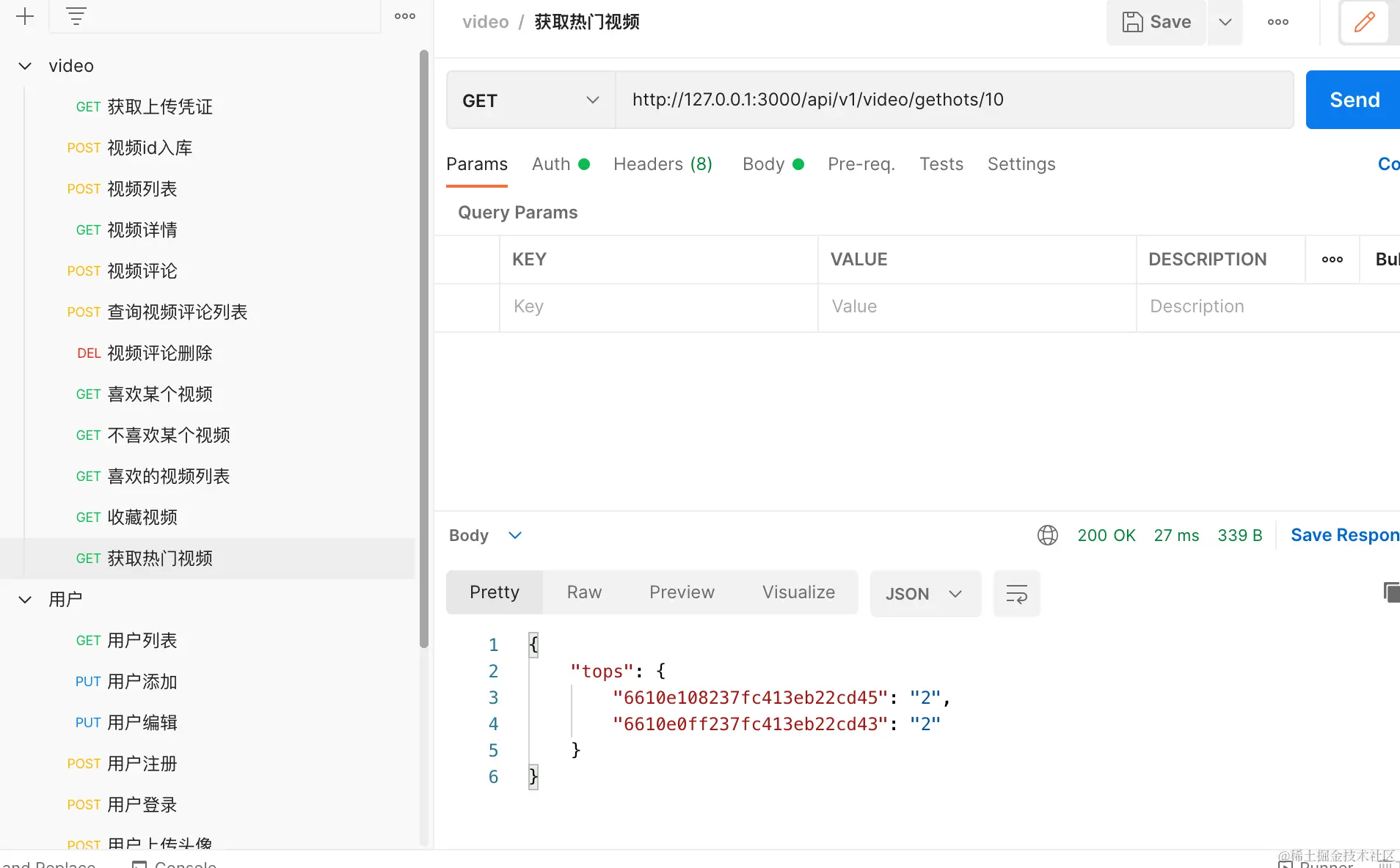 为了验证我们的推荐系统是否工作正常,我们可以使用Postman这样的API测试工具。通过发送一个GET请求到/getHots/:topNum,其中:topNum是我们想要获取的热门视频的数量,我们可以检查返回的数据是否正确。